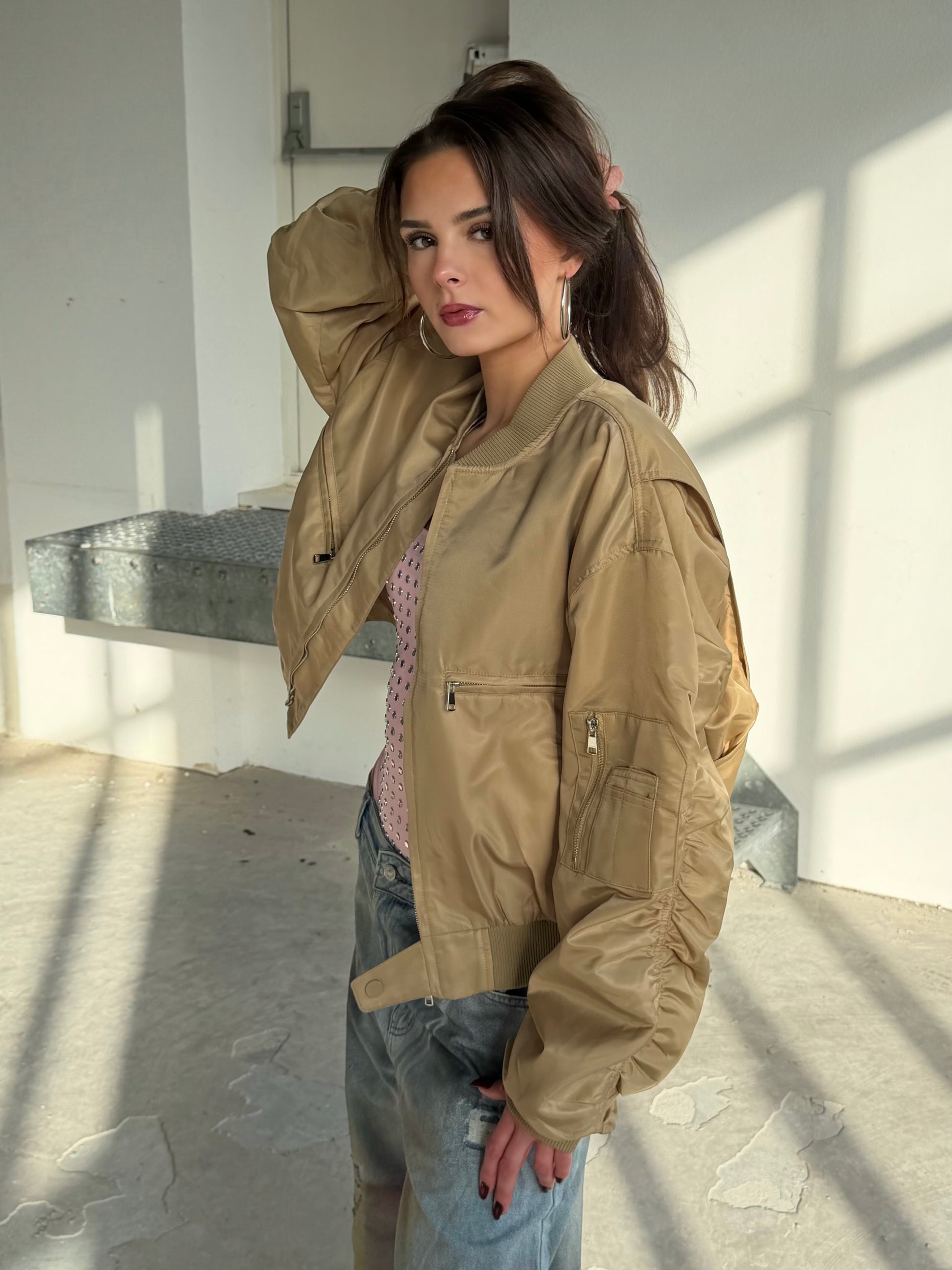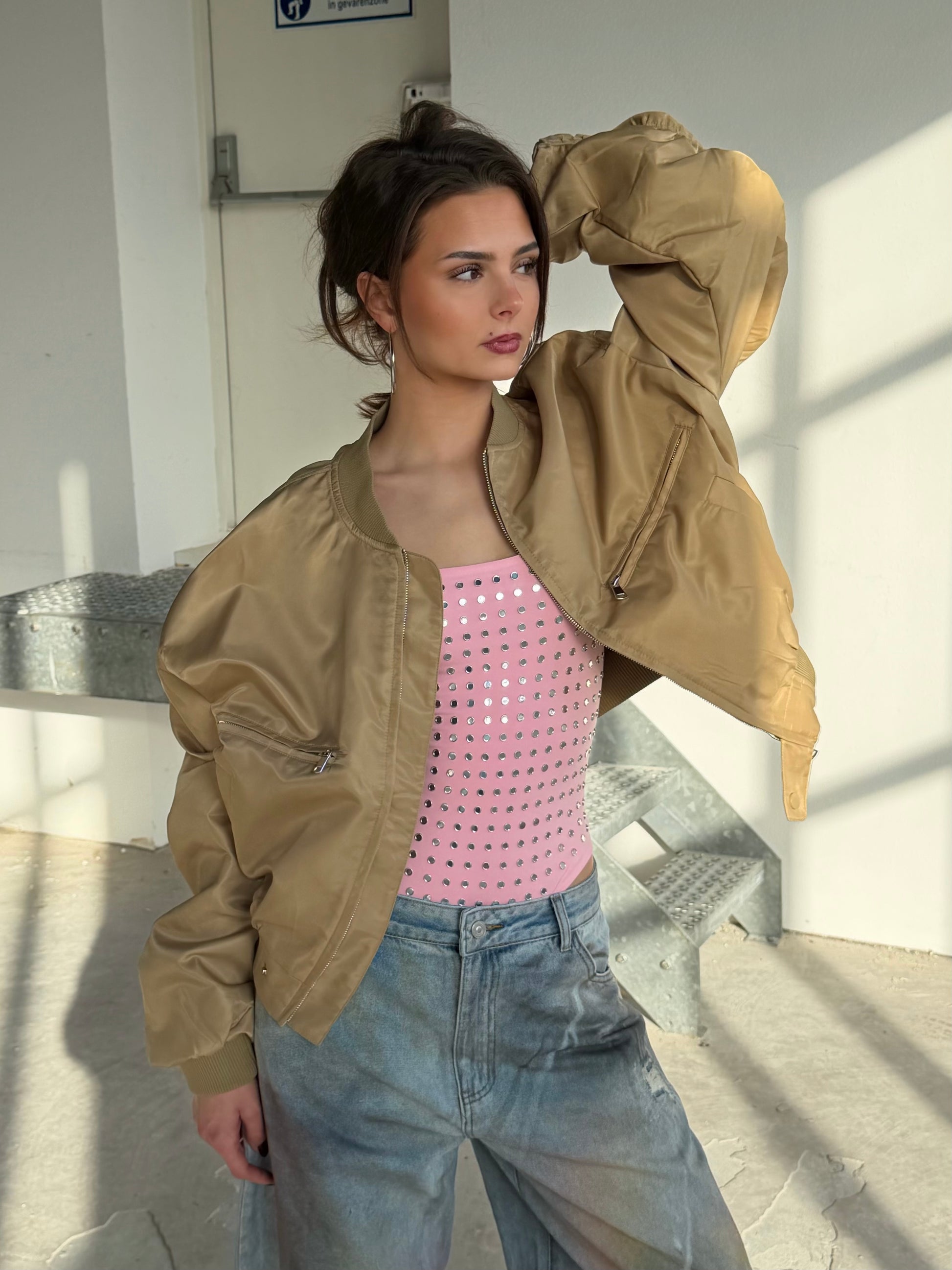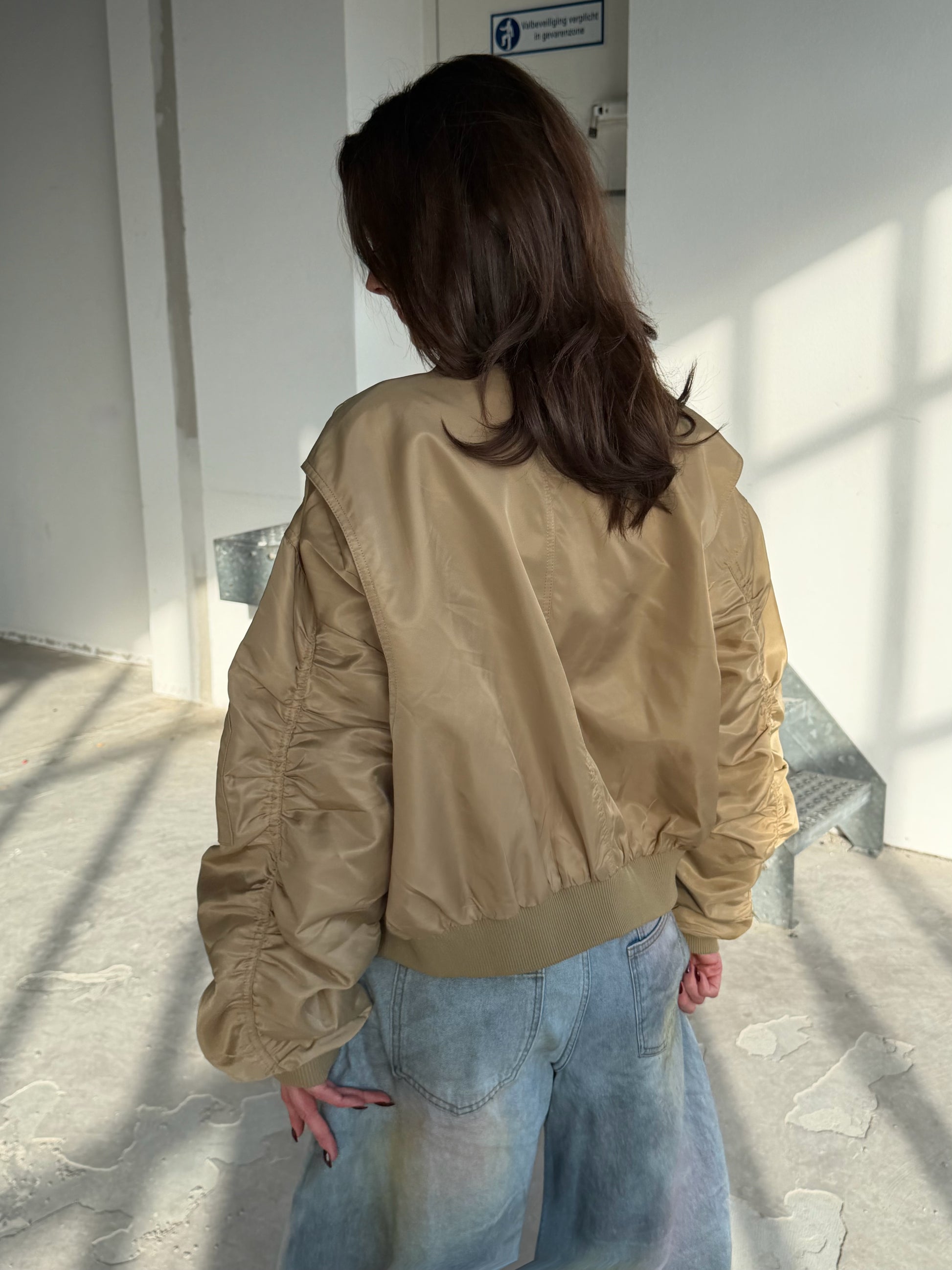 Stoer kort oversized jasje in een warme camel kleur perfect te combineren.