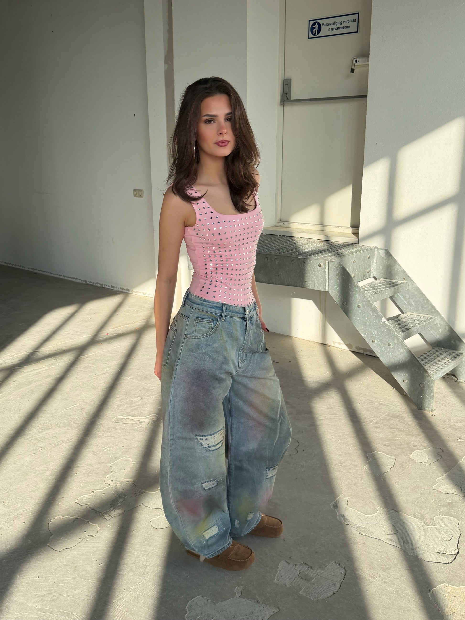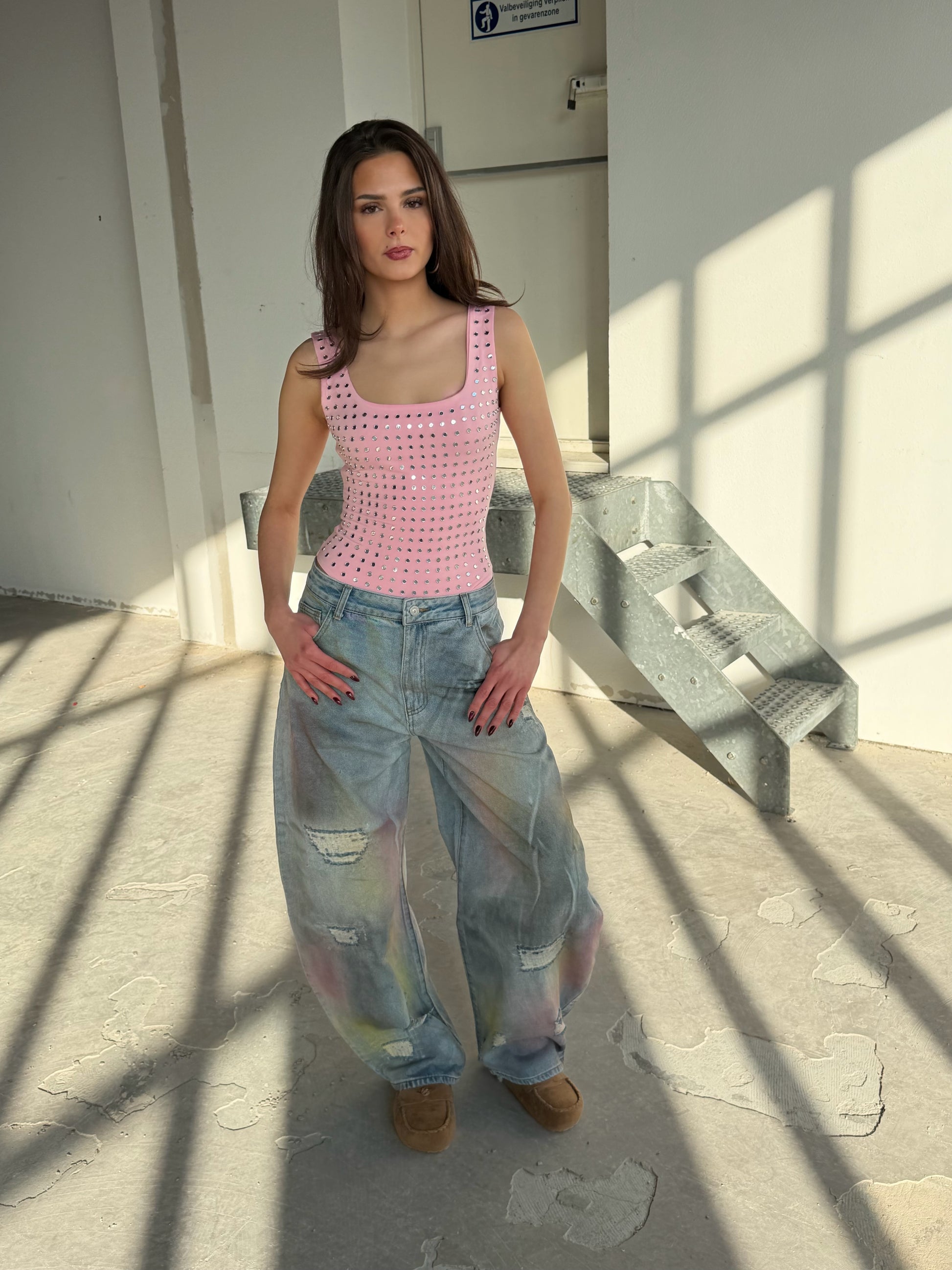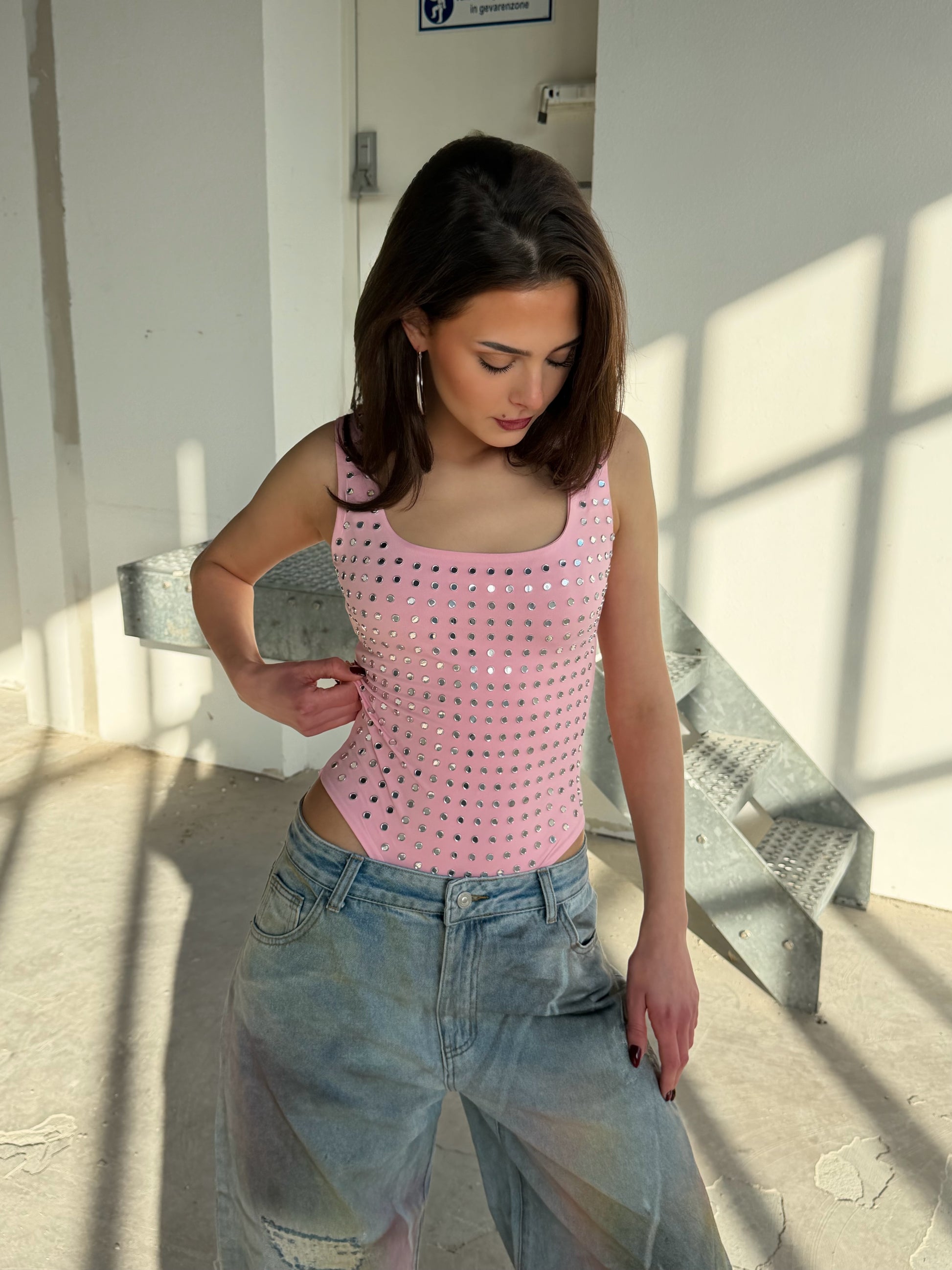 Deze body heeft een perfecte hals en een mooie aansluitende fit. De studs geven een glam uitstraling zonder te overdrijven. Draag de body met onze Emerson jeans en je bent ready to go!