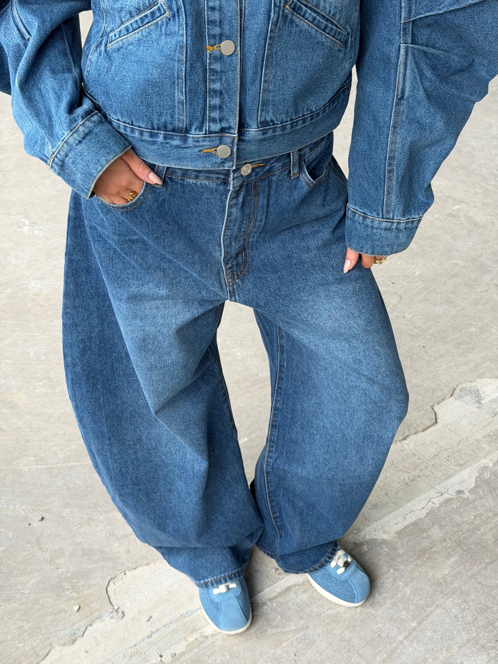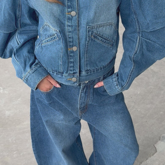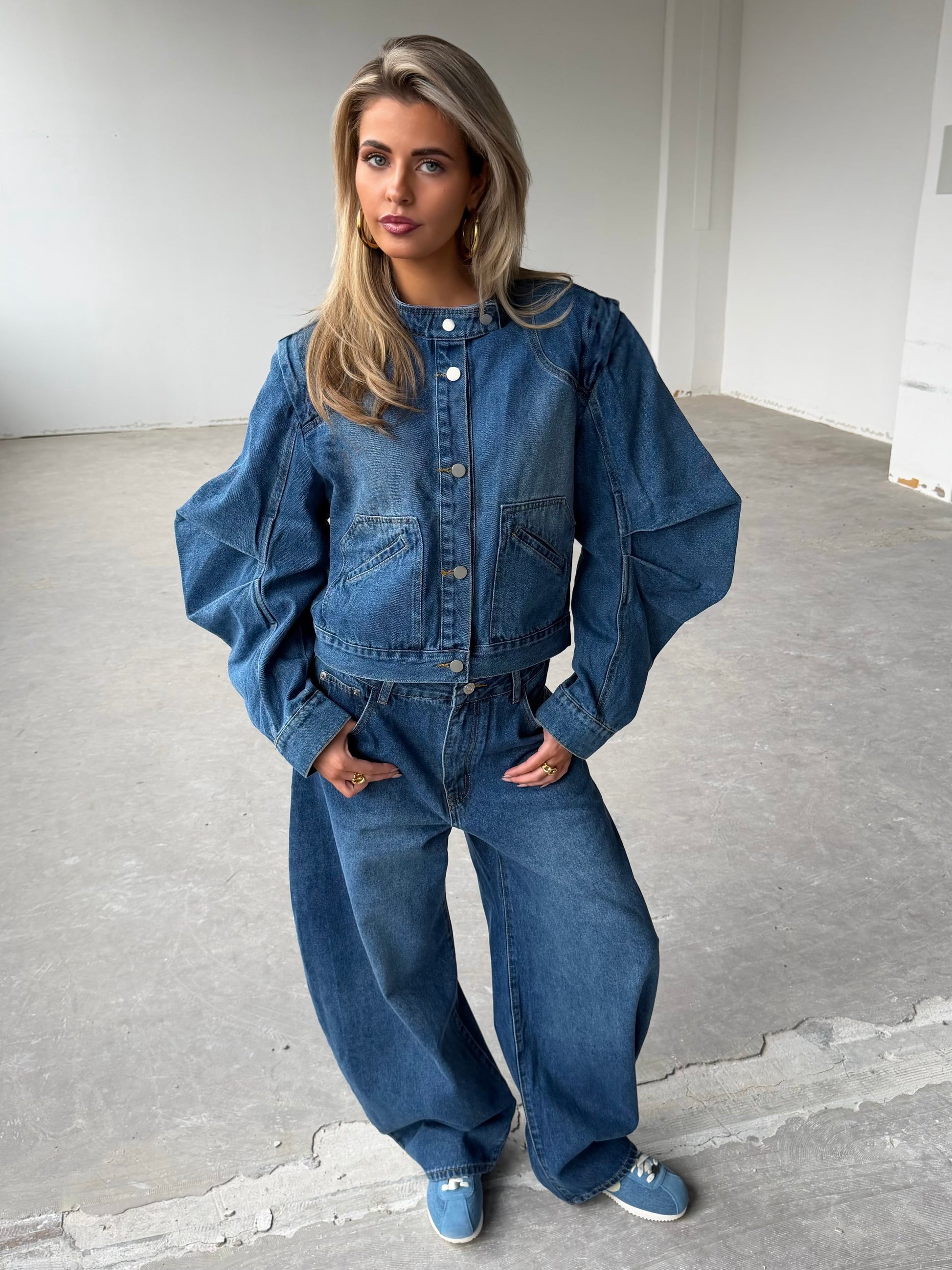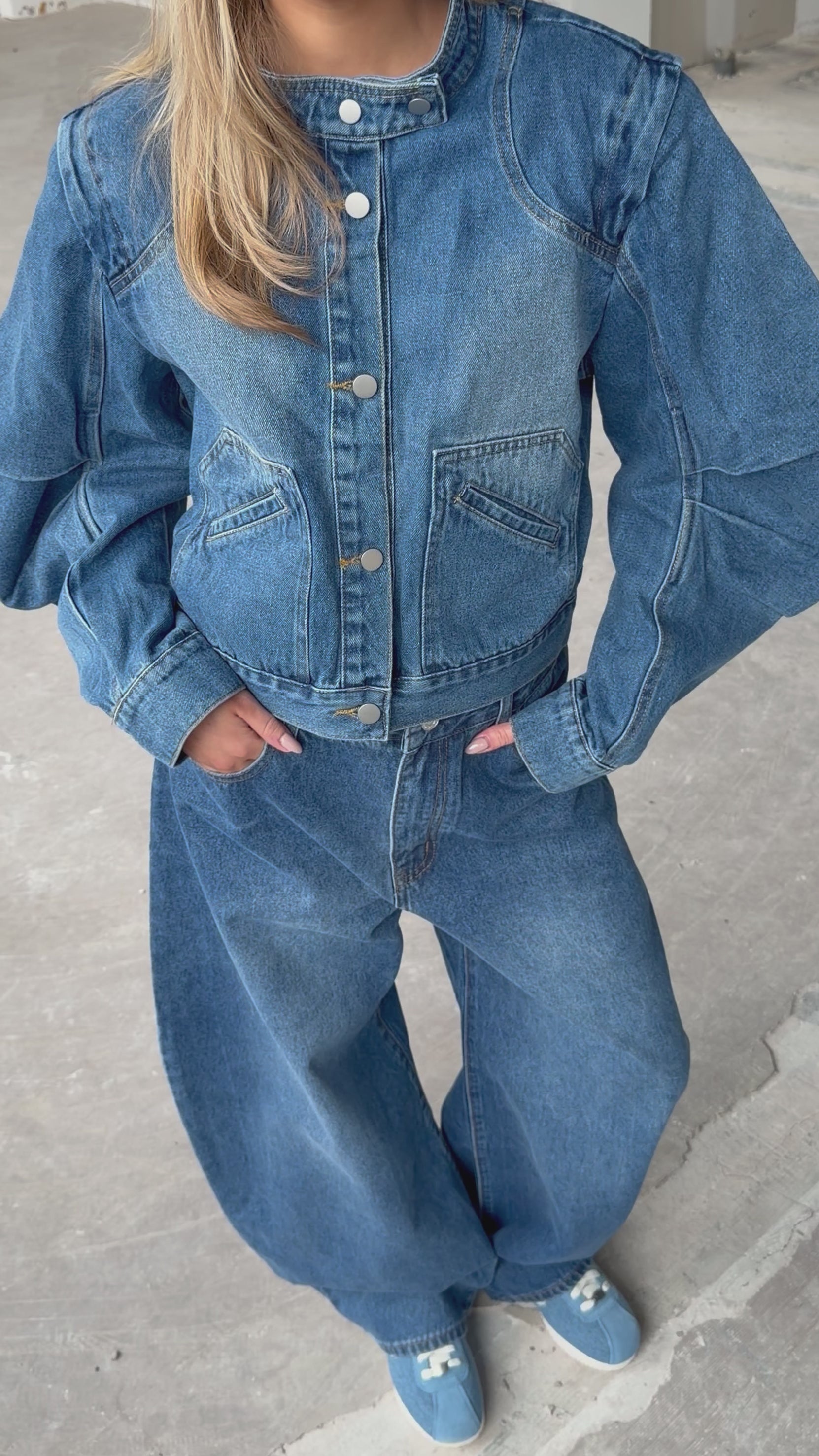 Onze Monroe jacket heeft de perfecte jeanskleur en stoere details zoals schoudervulling en een grote ingenaaide pofmouw. De Monroe jacket is mooi als set met de Riley jeans.