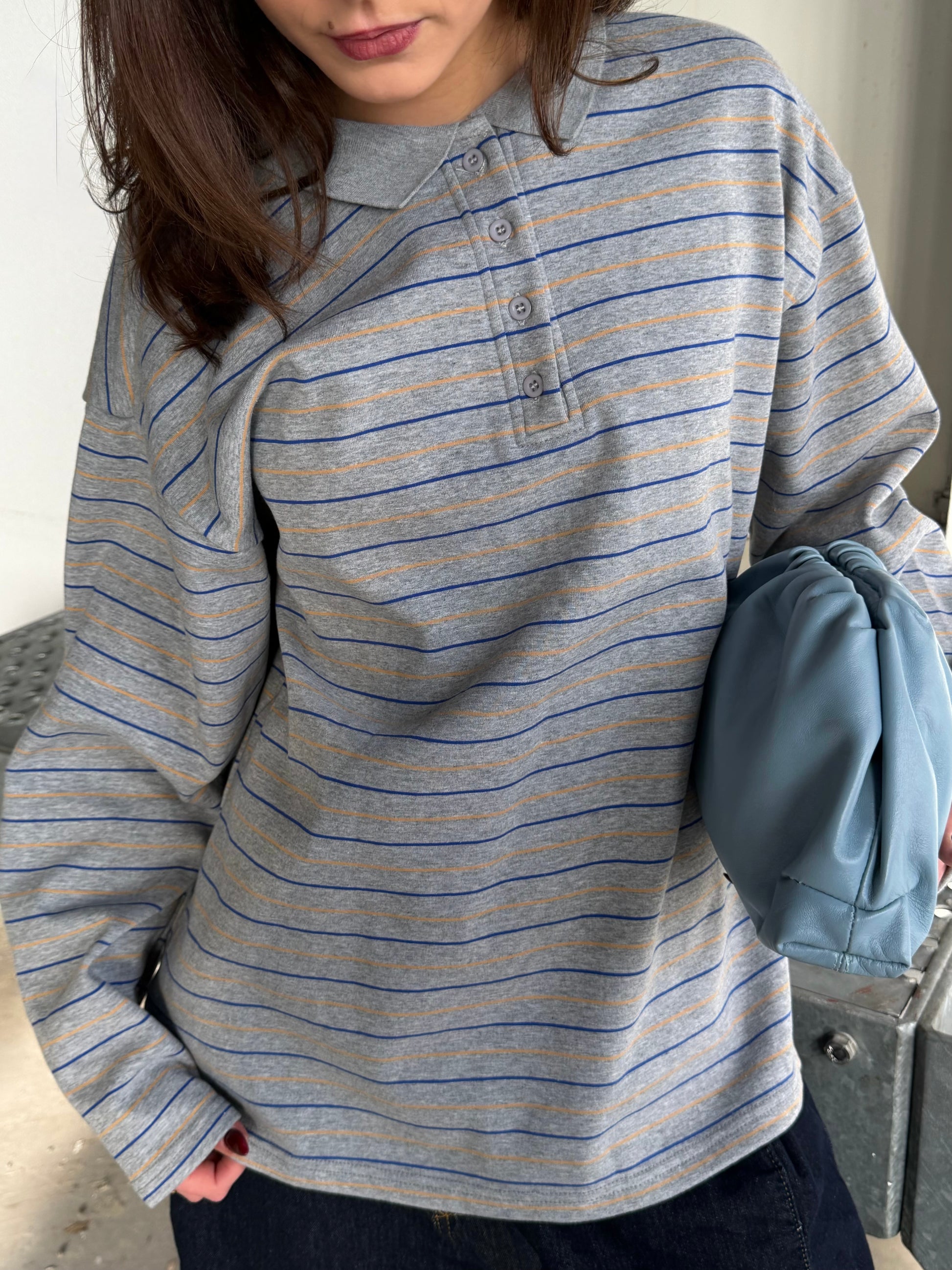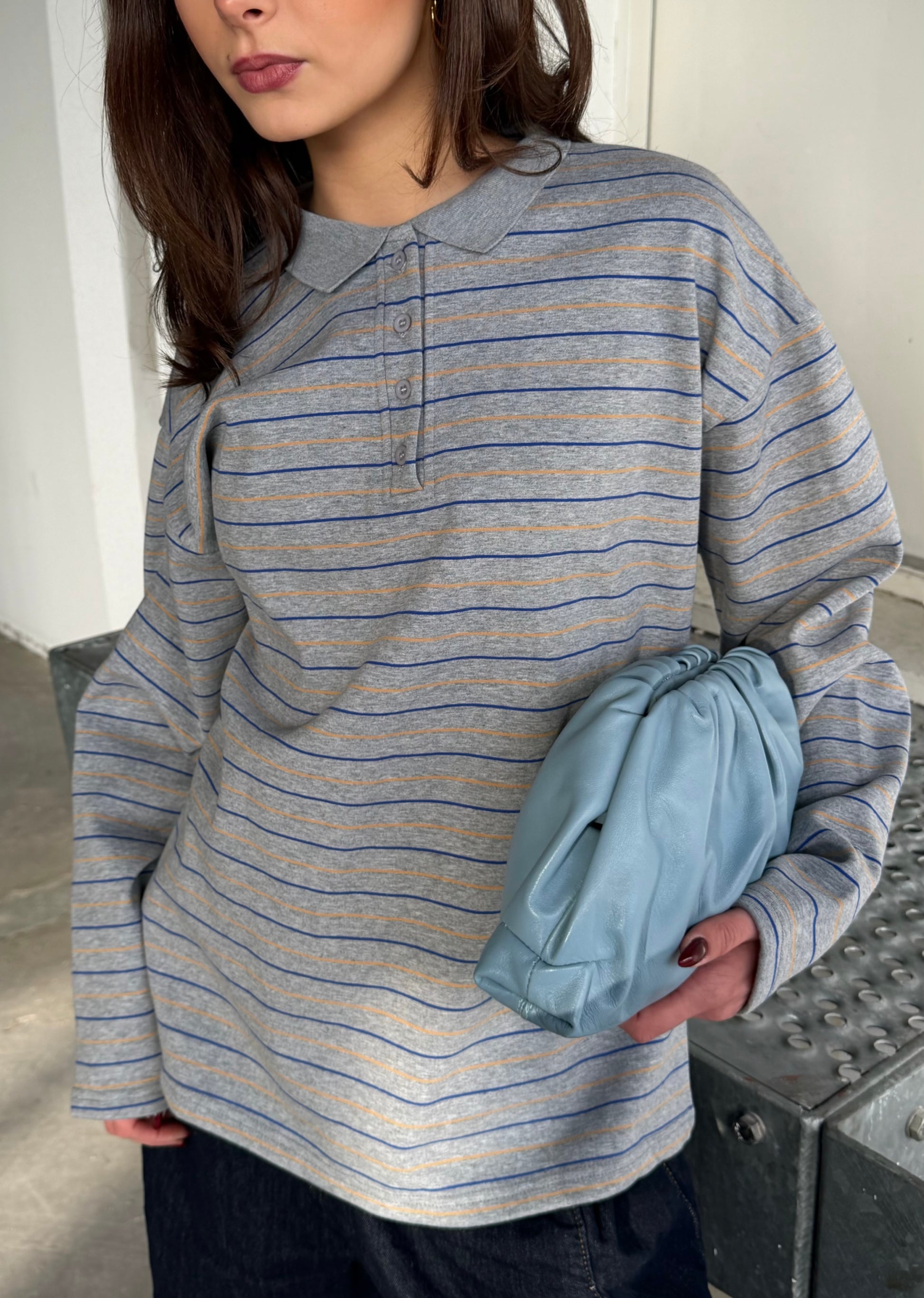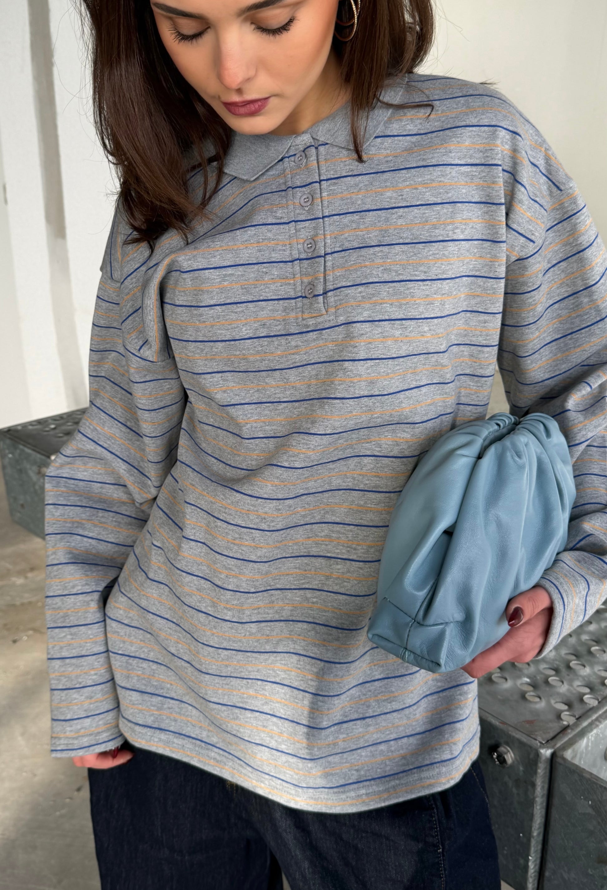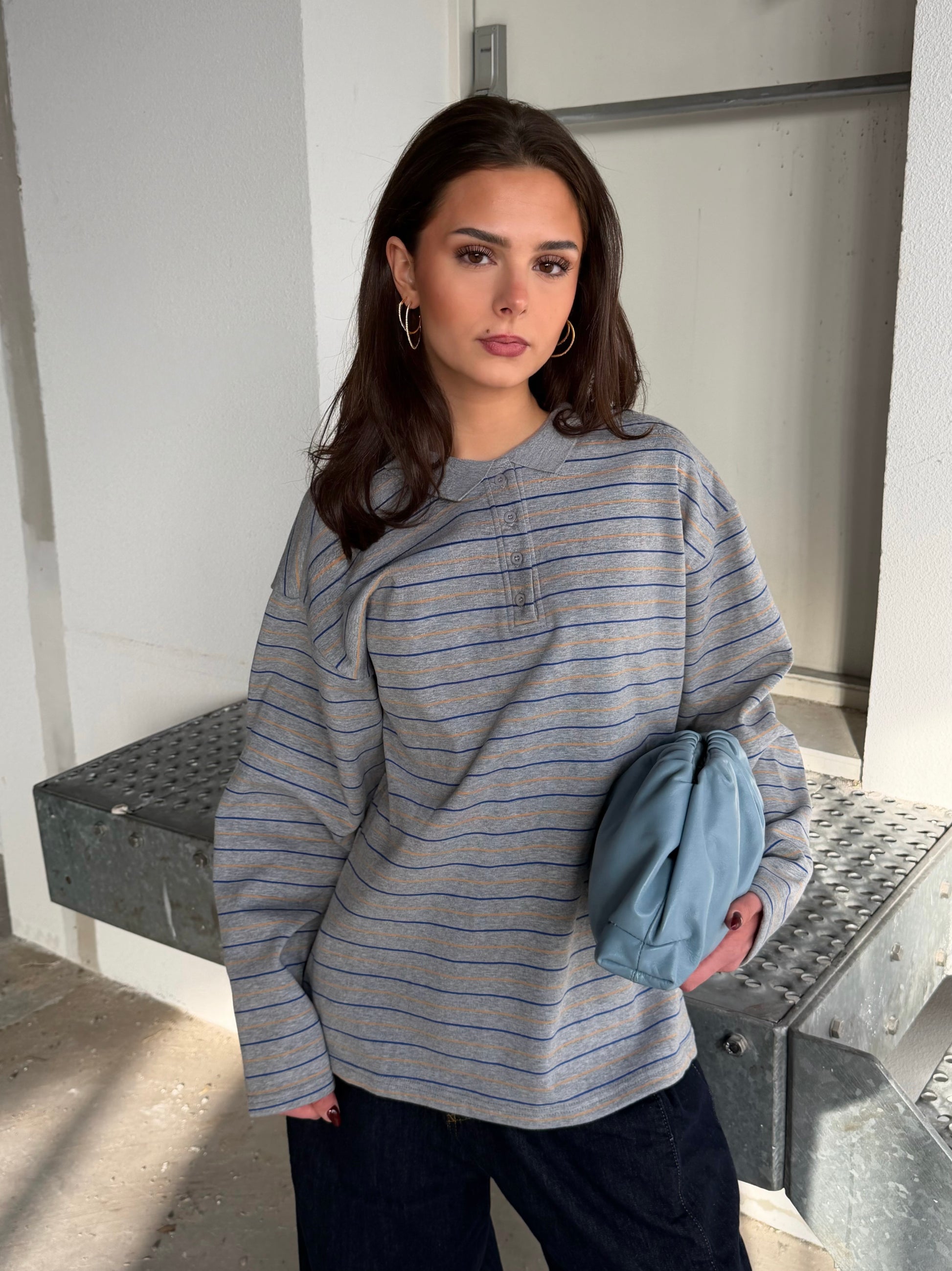 Oversized grijze polo met streepjes. Boxy fit in een fijne zachte stof die mooi valt. Deze polo is de key piece van 2026.