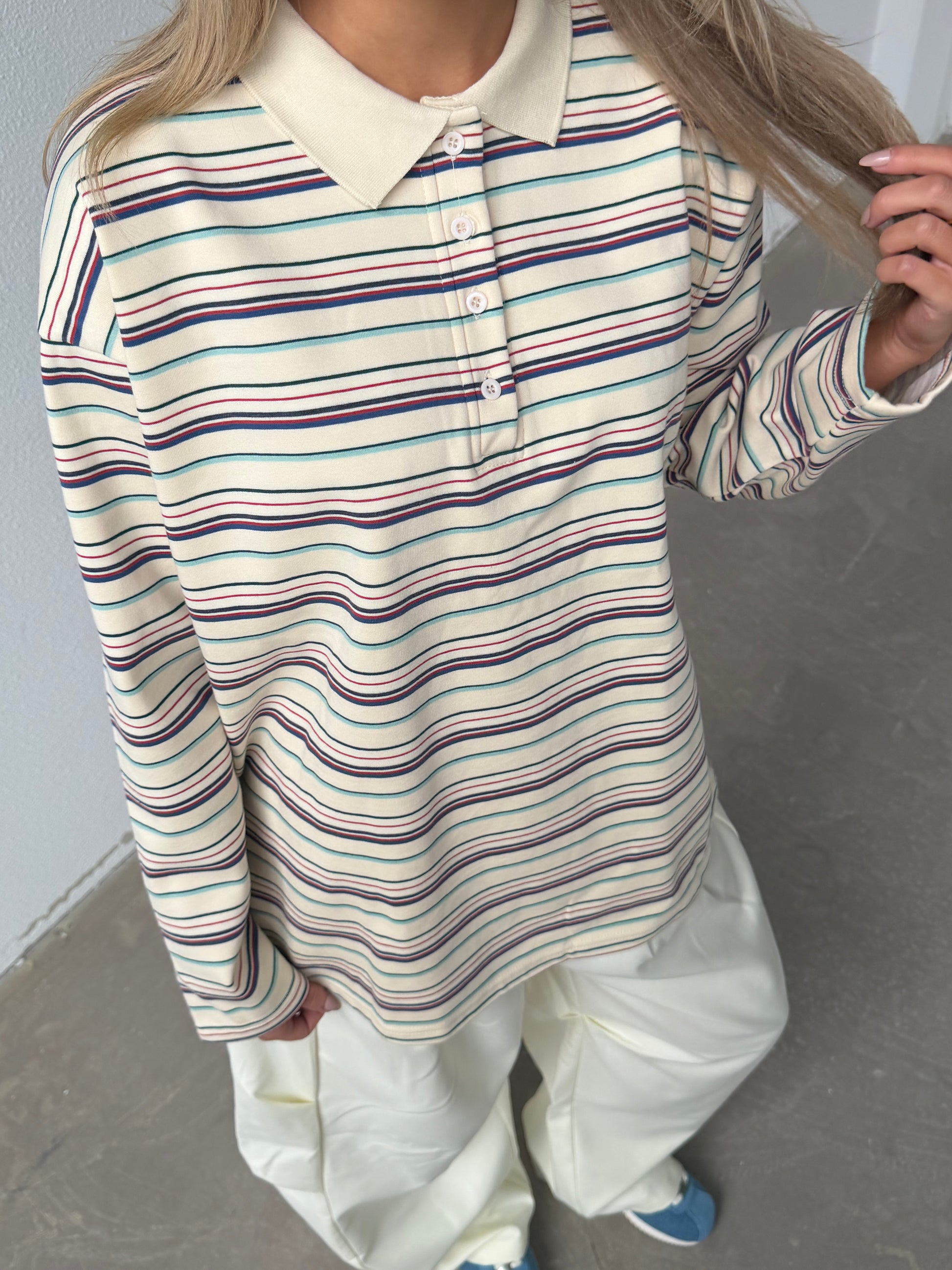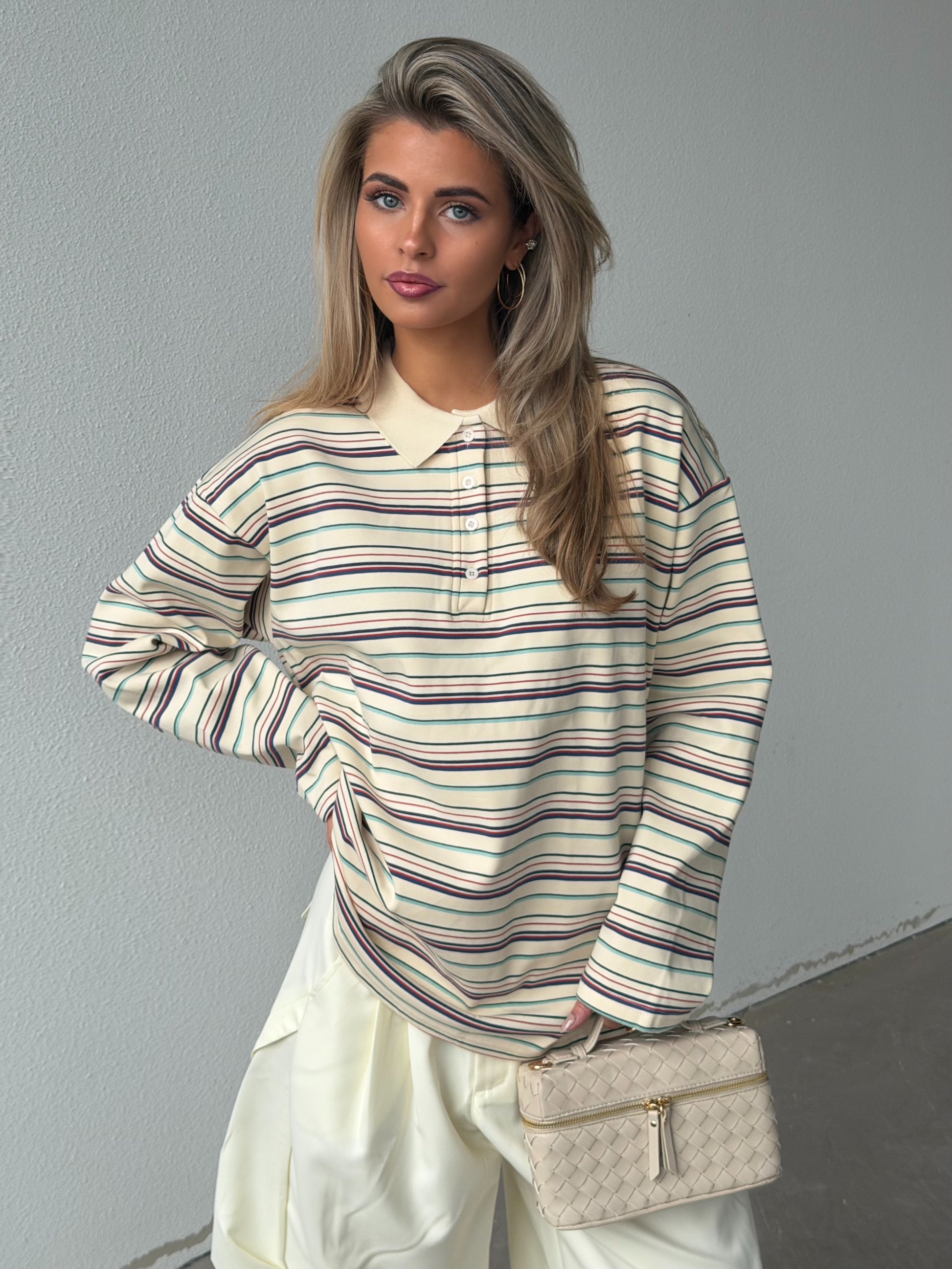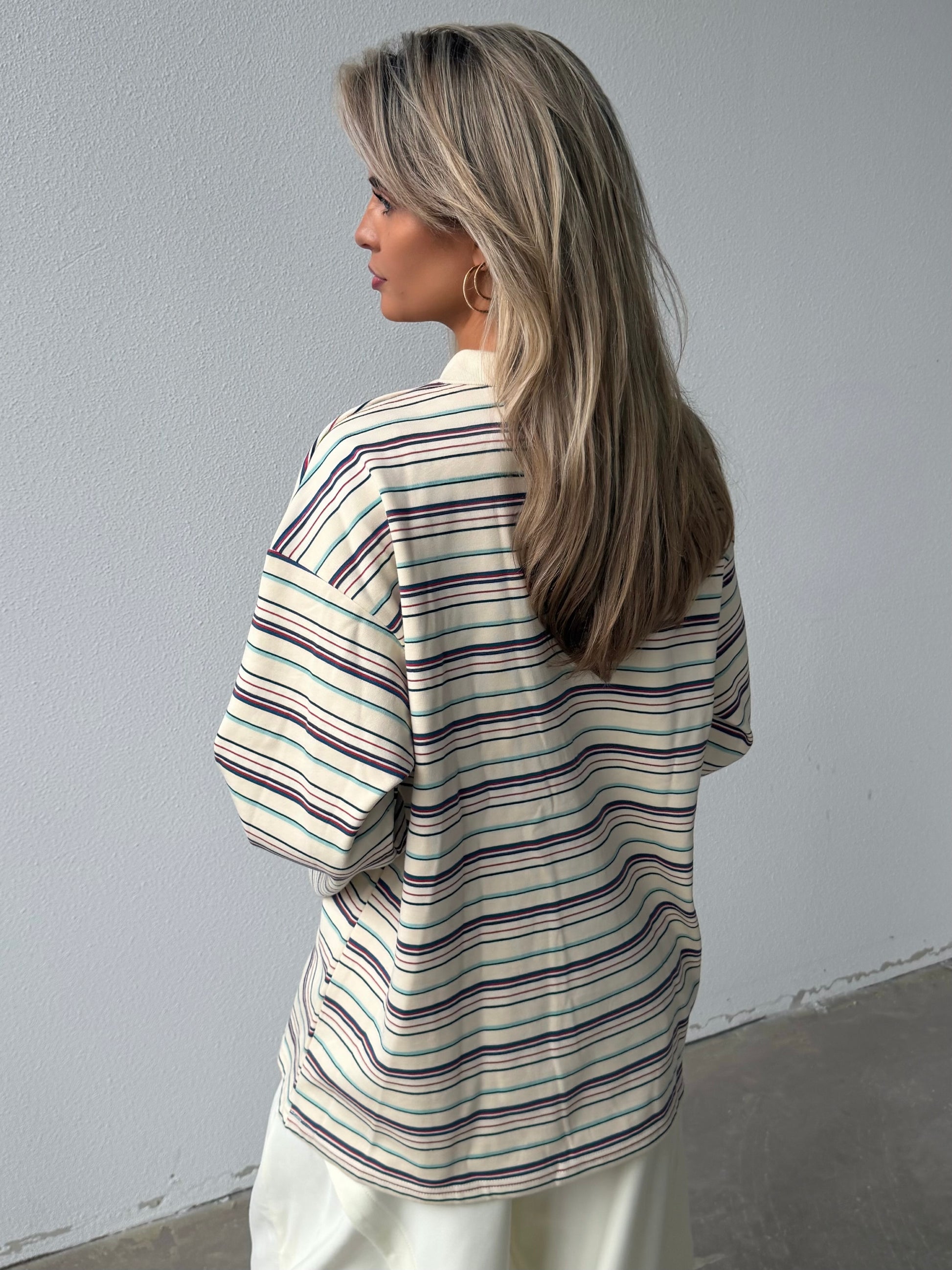 Oversized ecru polo met streepjes. Boxy fit in een fijne zachte stof die mooi valt. Deze polo is de key piece van 2026.