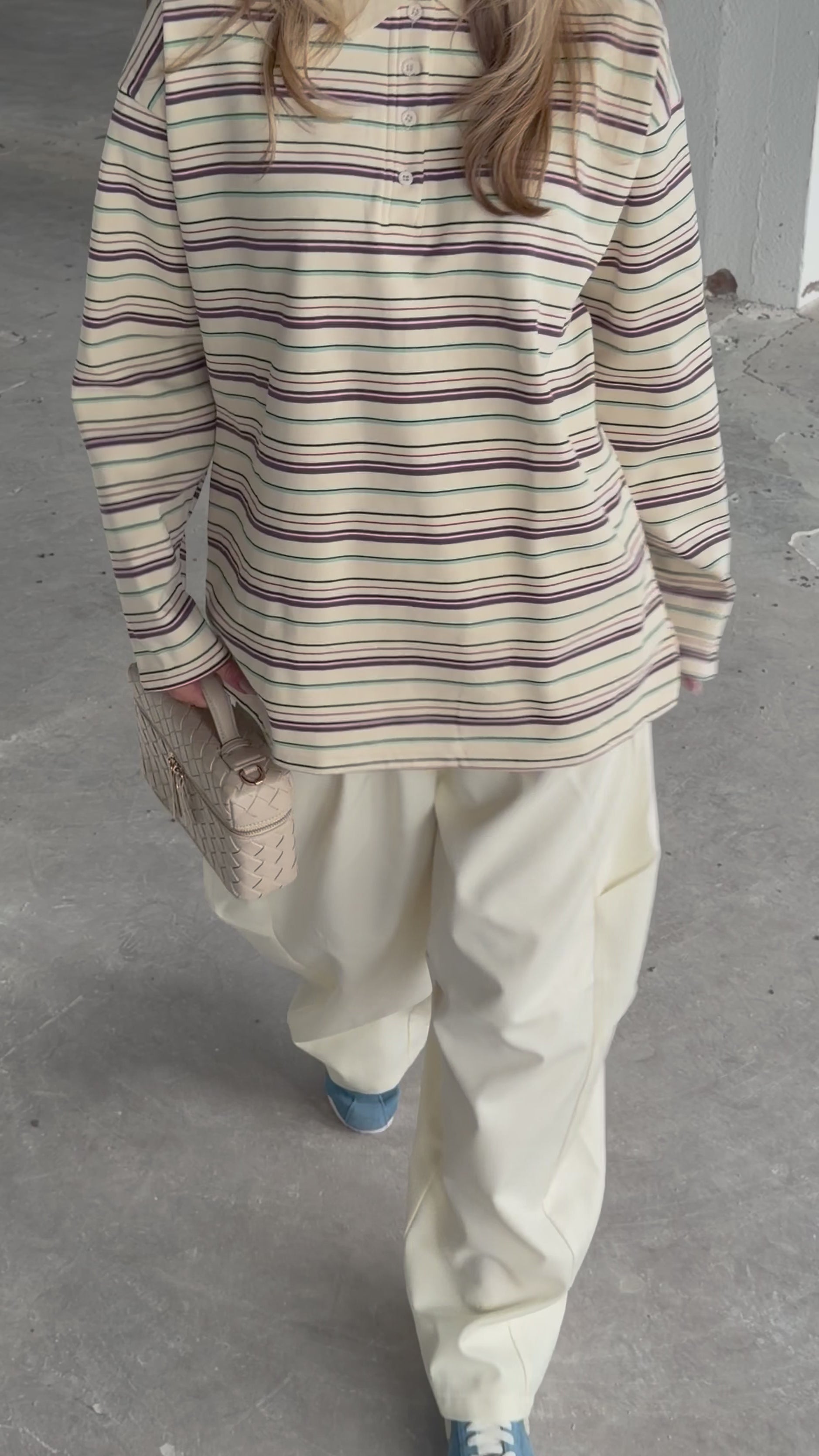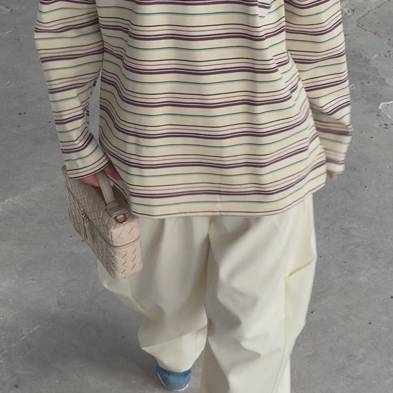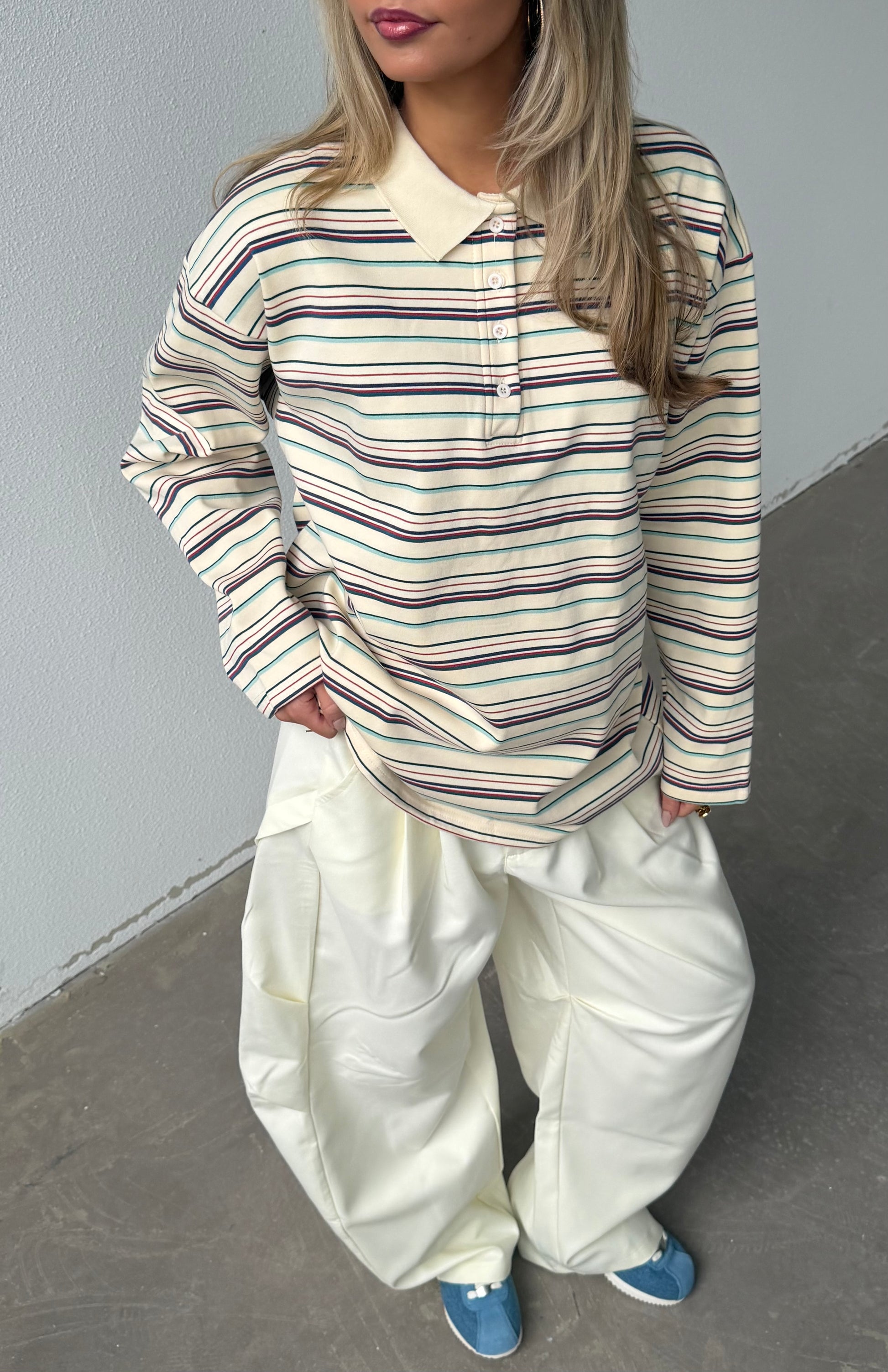 Oversized ecru polo met streepjes. Boxy fit in een fijne zachte stof die mooi valt. Deze polo is de key piece van 2026.