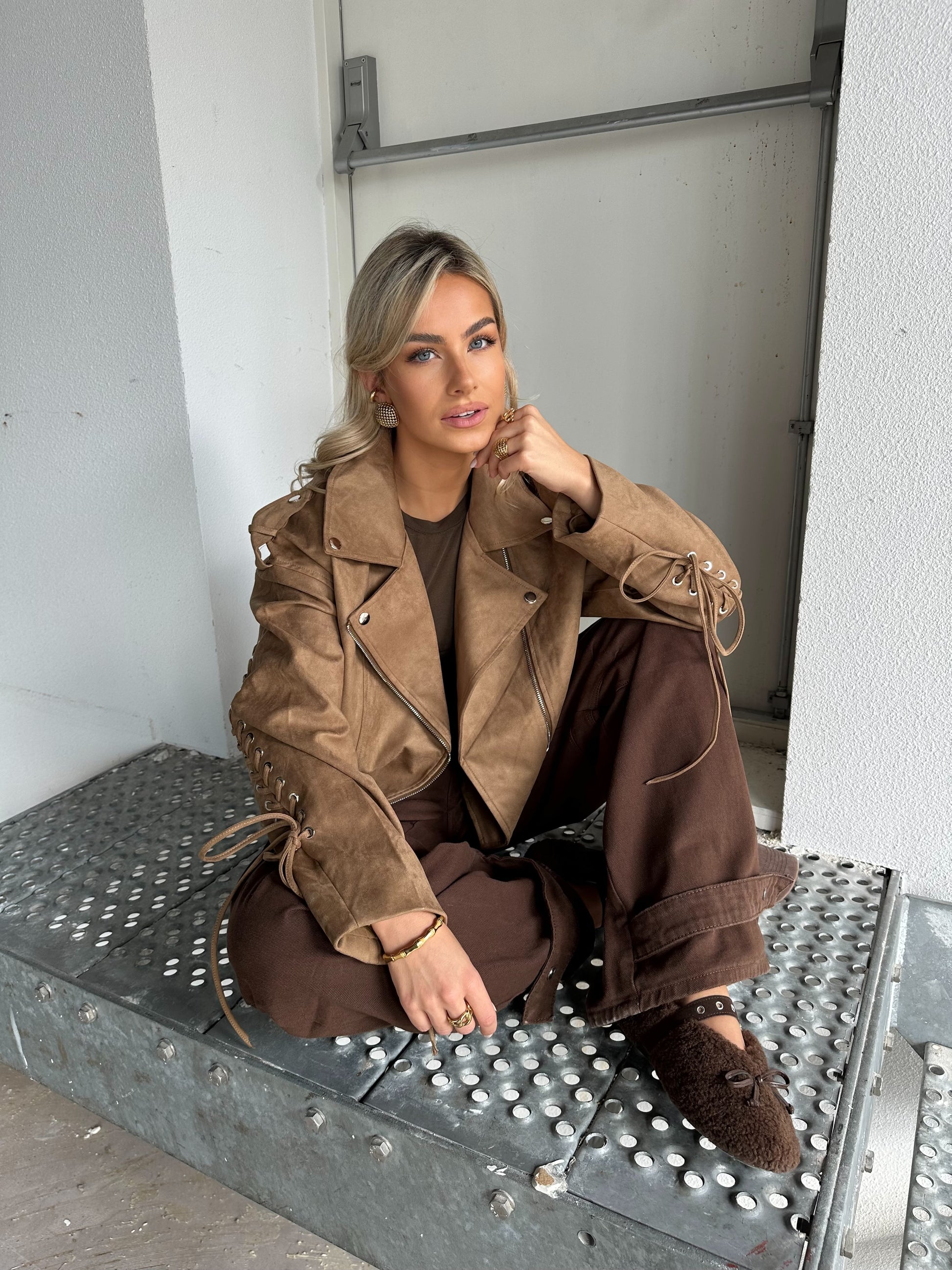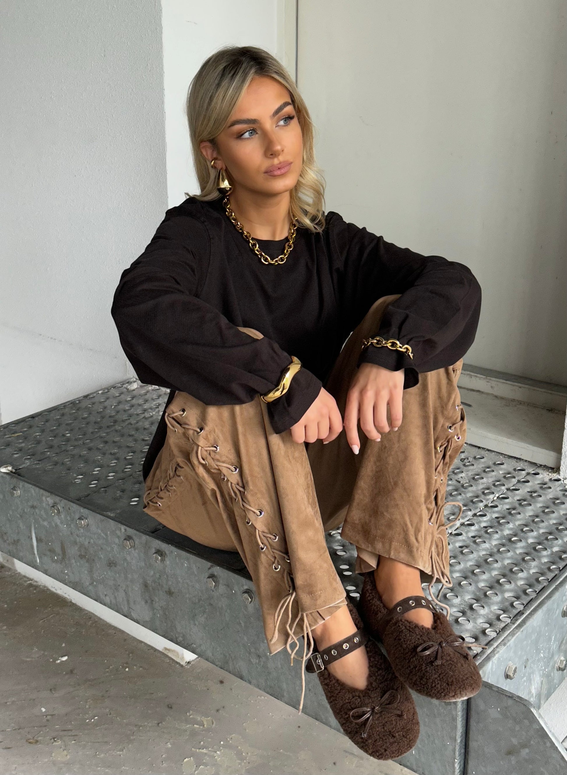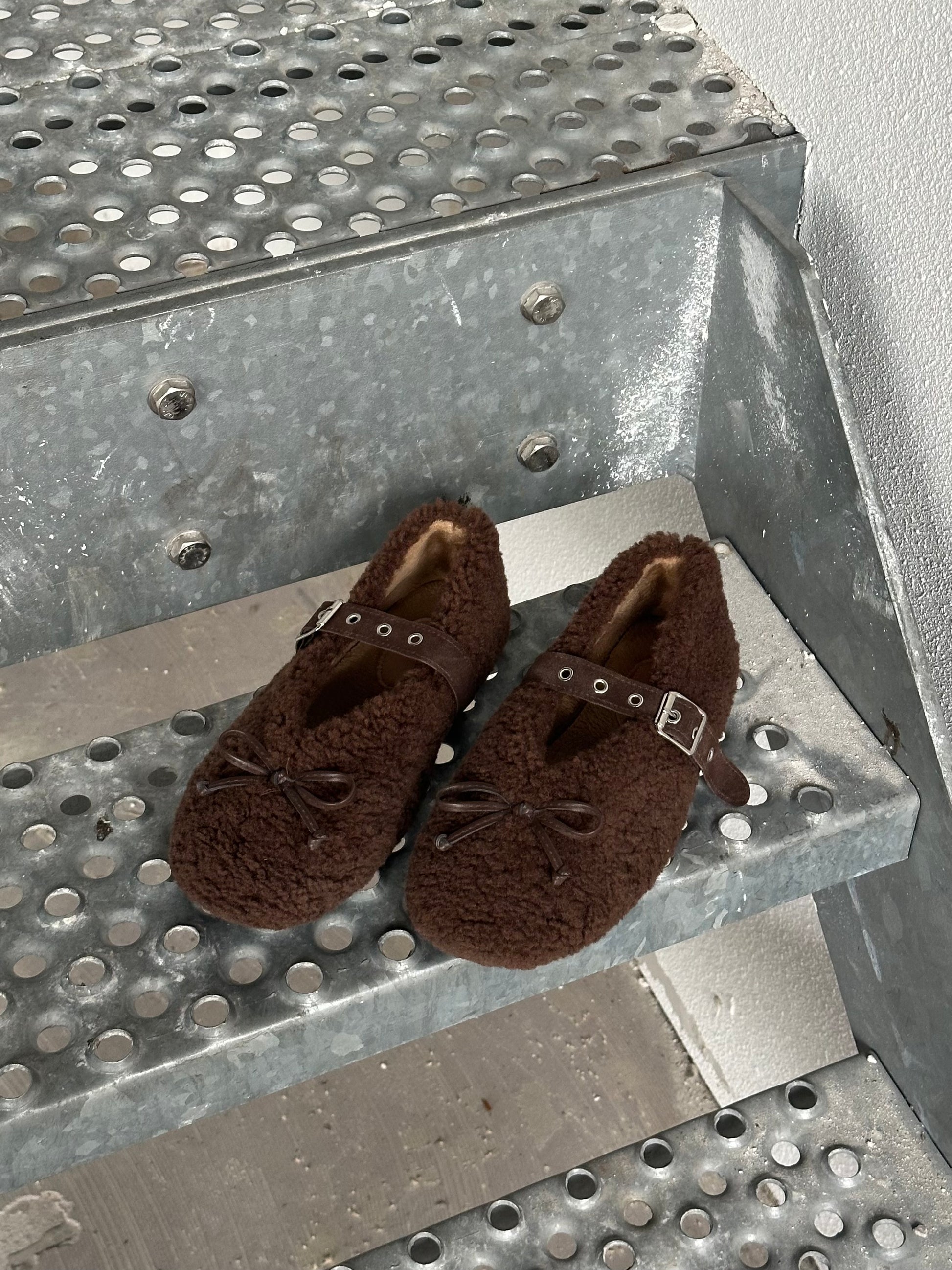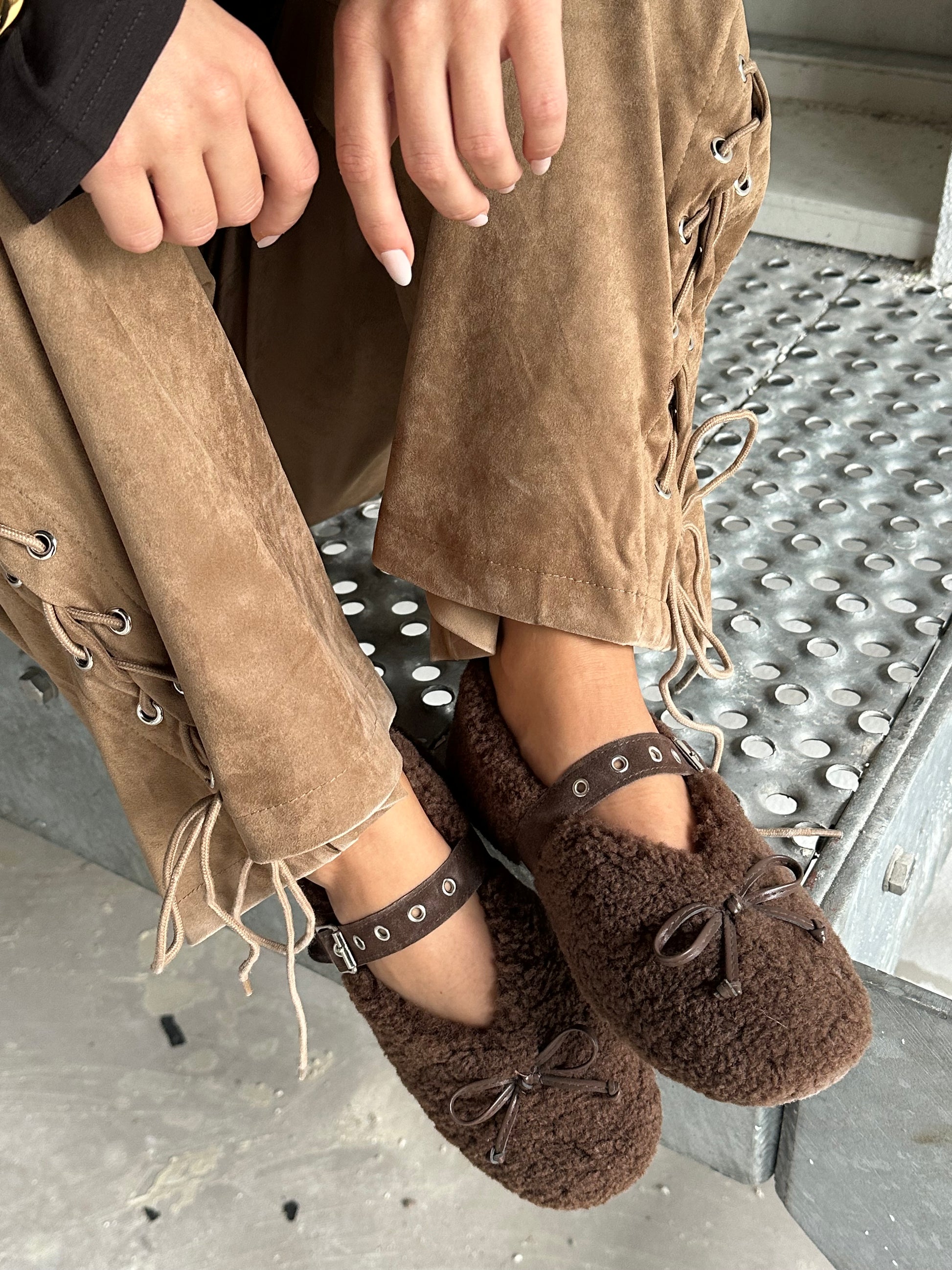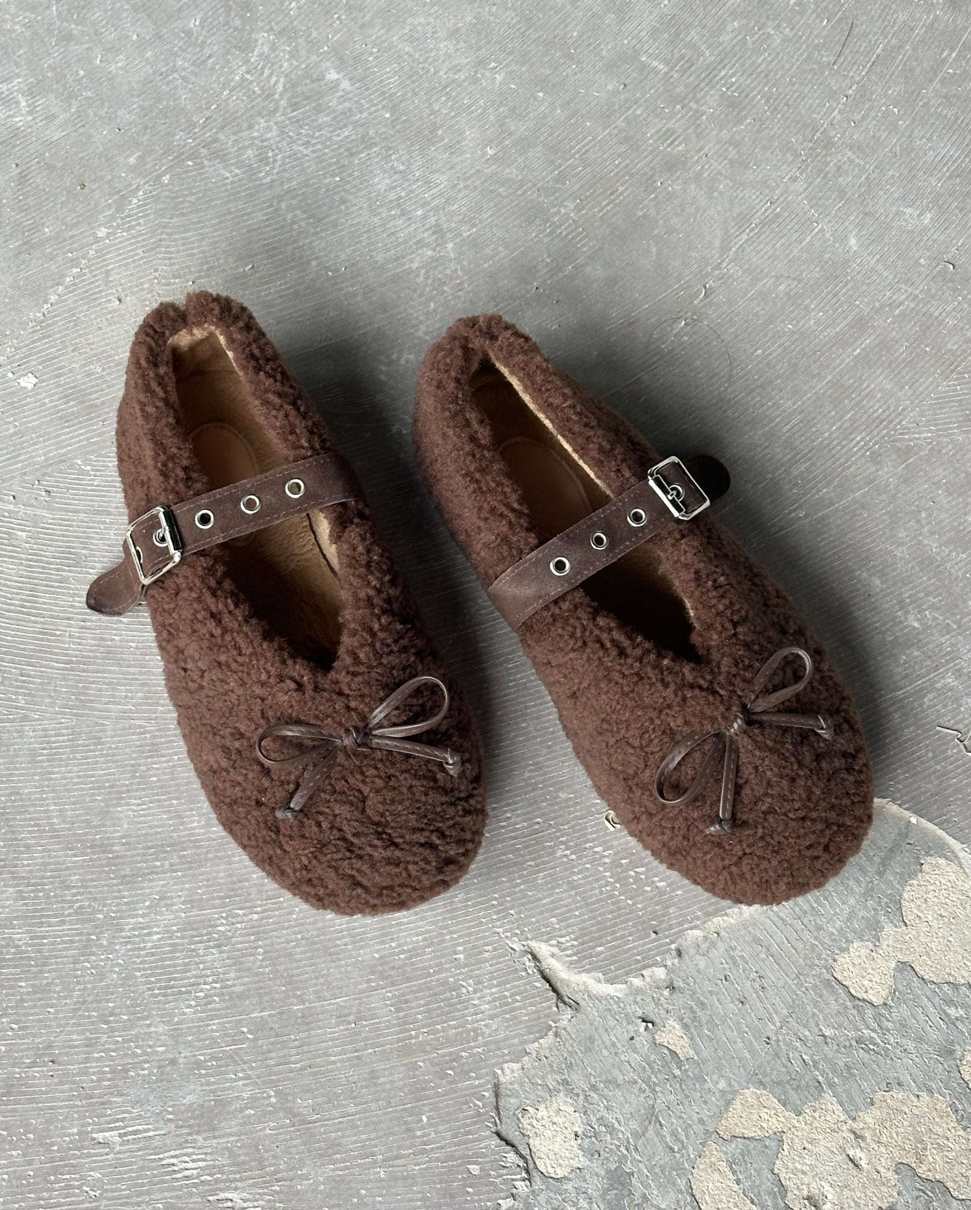 Donkerbruine ballerina in borglook, zacht en stijlvol, strikje op de neus en verstelbaar bandje voor een perfecte pasvorm. De ballerina heeft een rubberen zool.