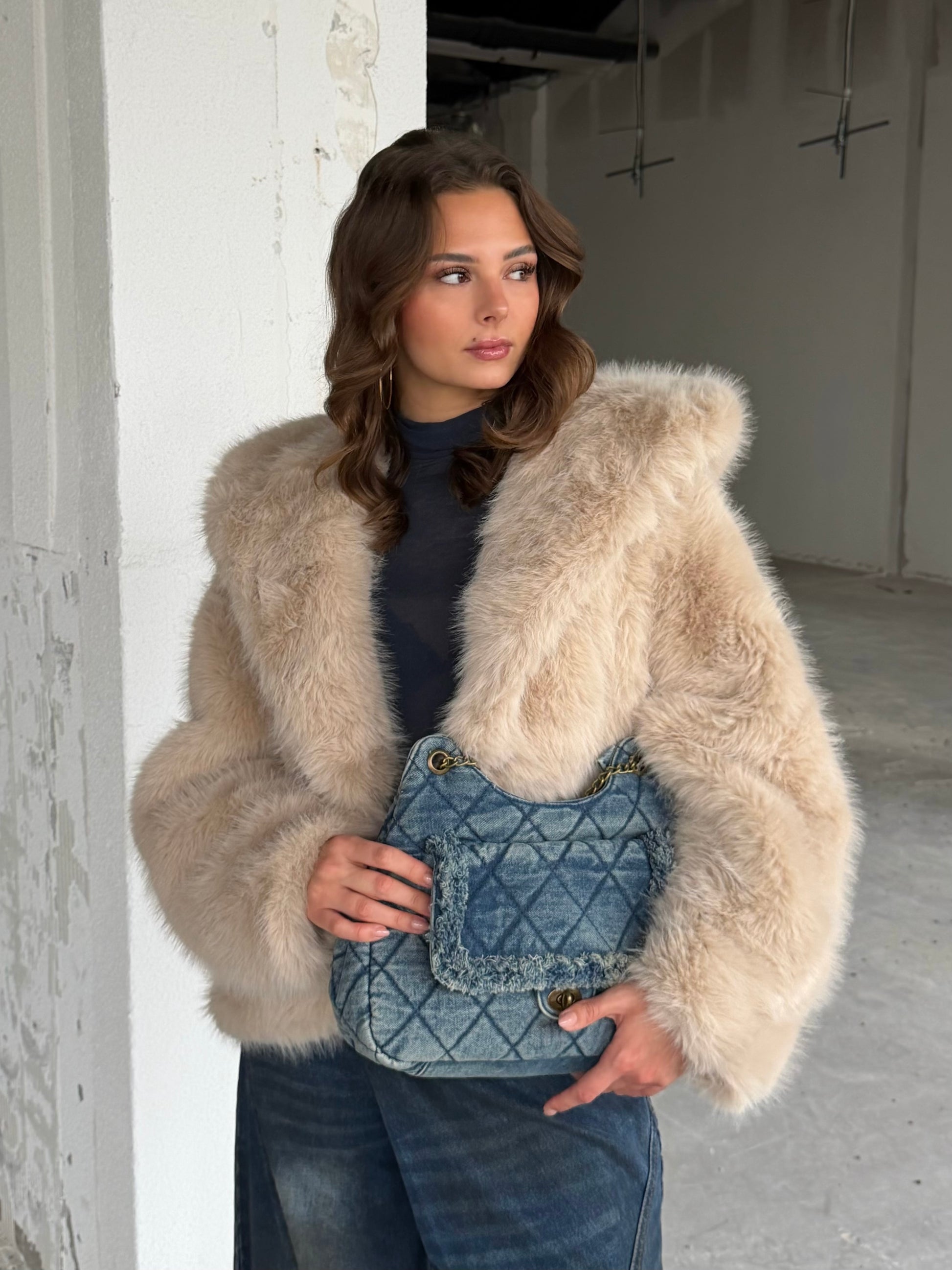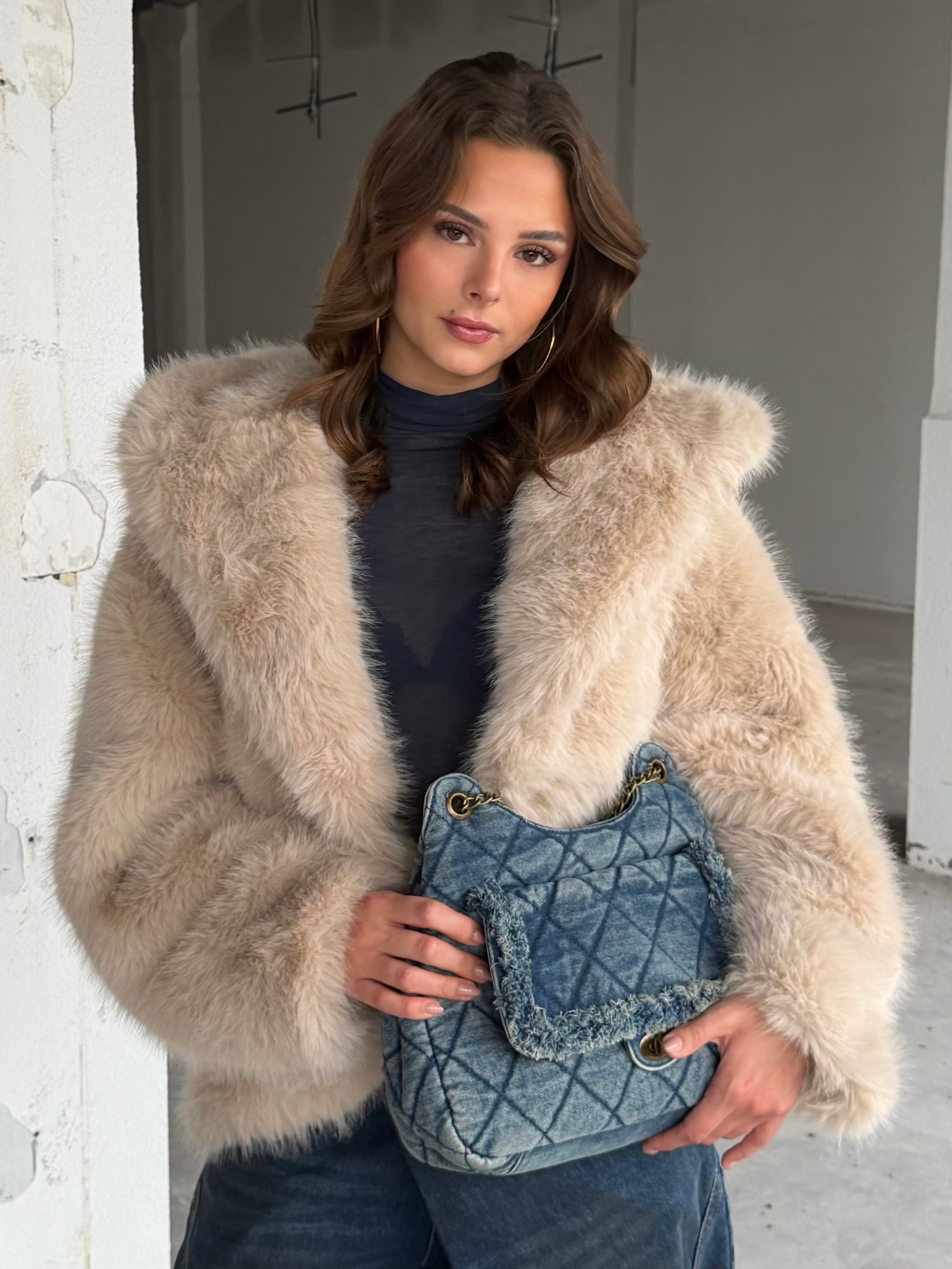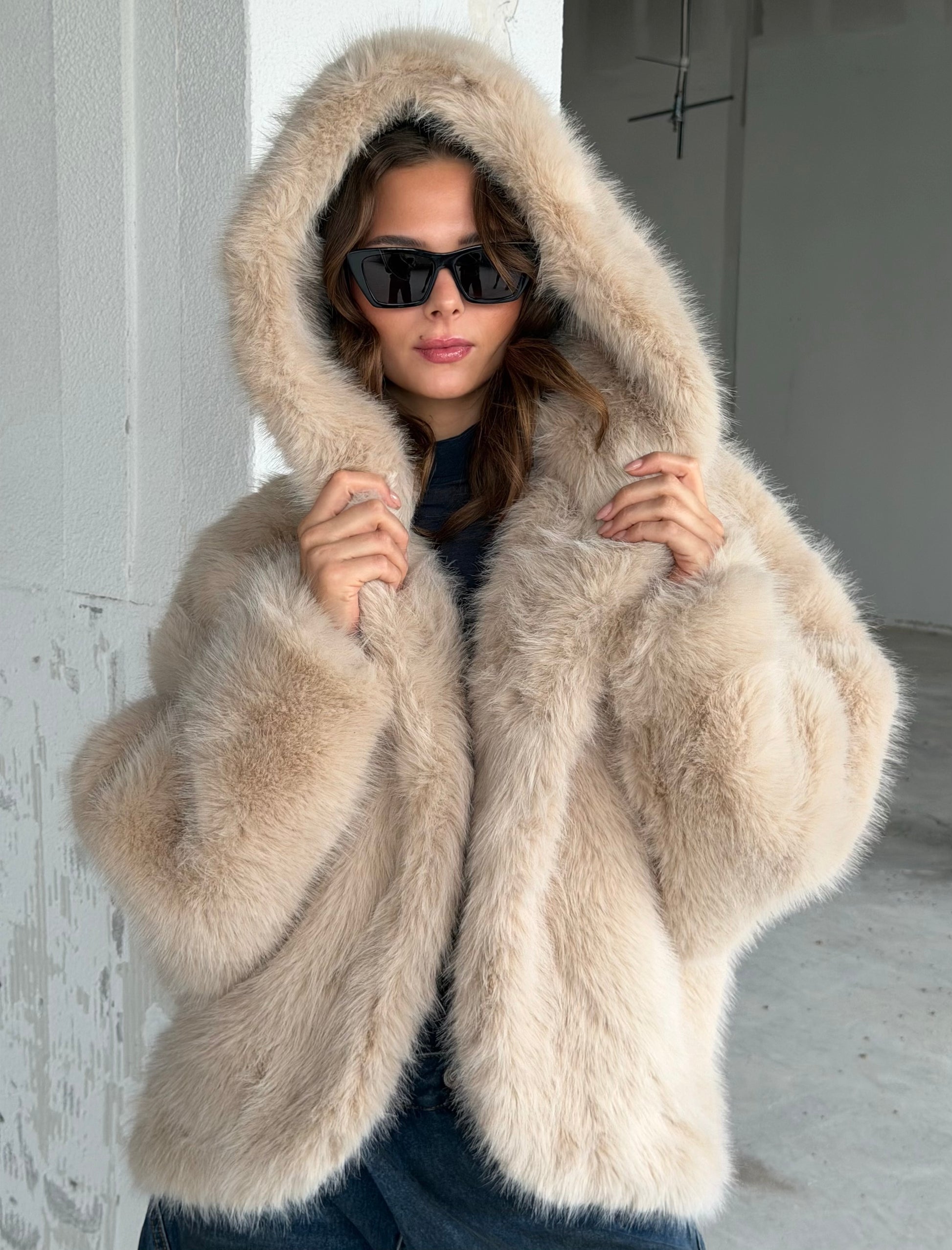 Oversized bont jasje in een mooie crème kleur. De grote capuchon zorgt niet alleen voor een trendy look, maar houdt je ook heerlijk warm tijdens koude dagen.