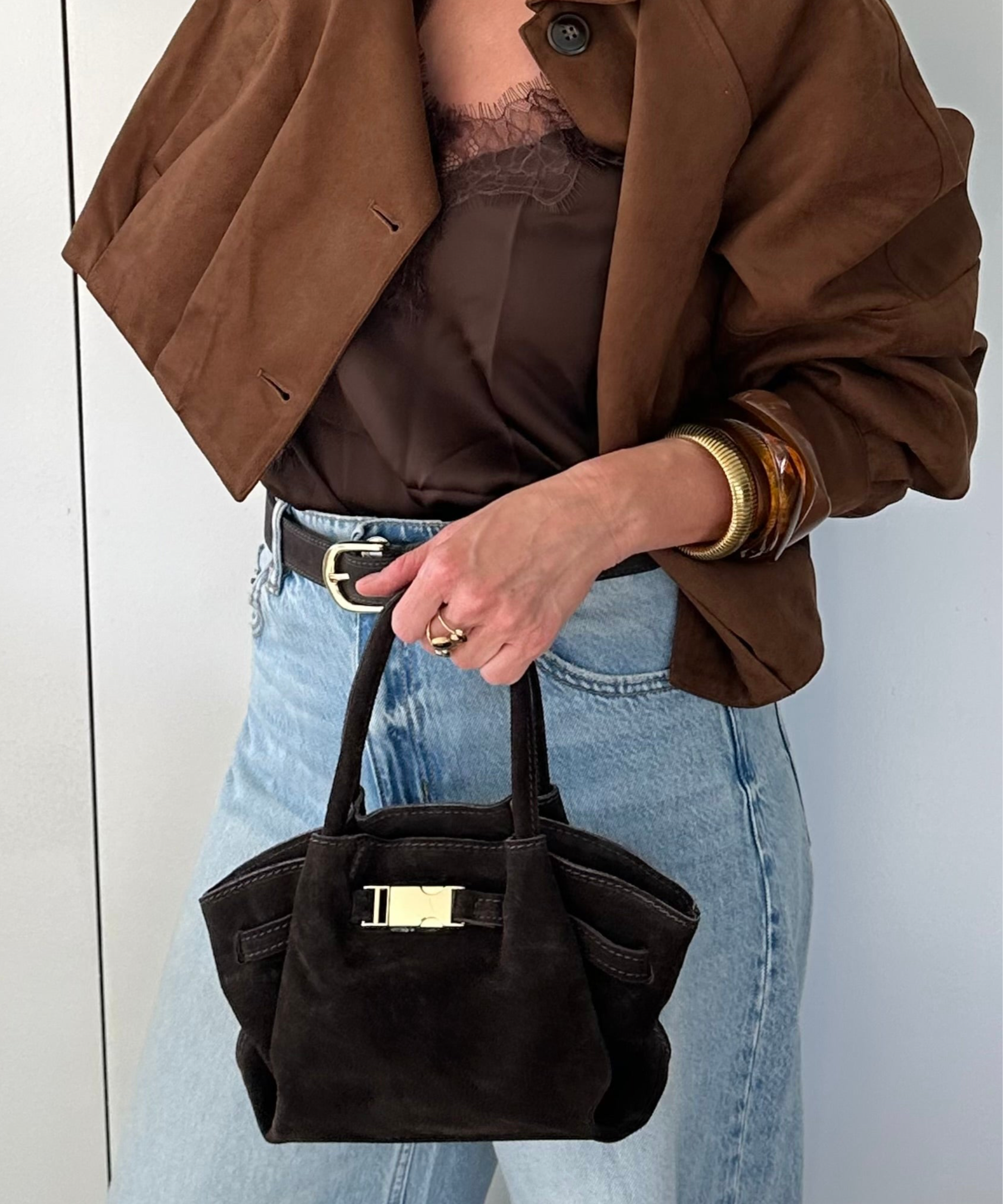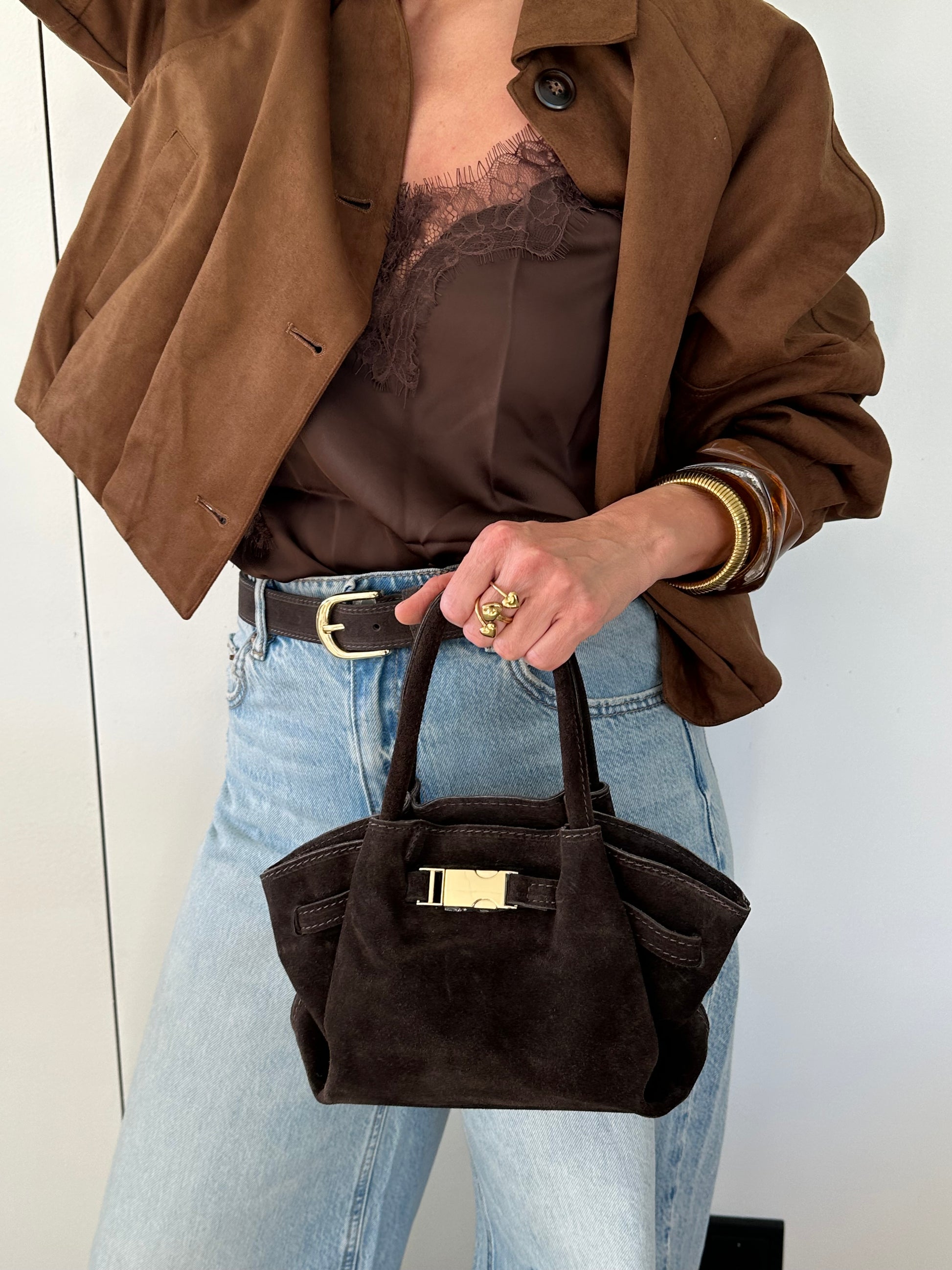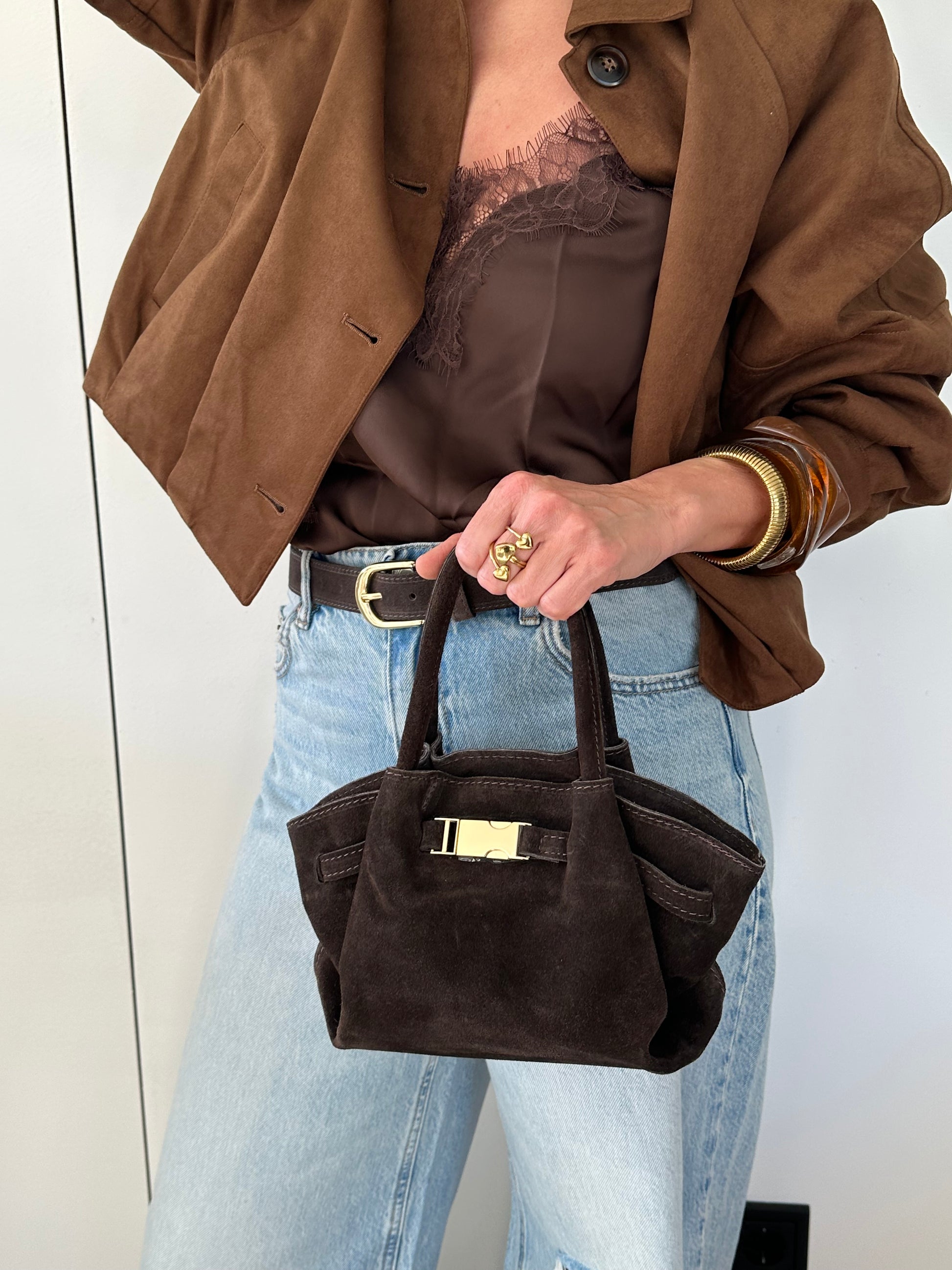 Een leren handtas vervaardigd uit suede leer. De handtas is ook te dragen als een crossbody tas. De ‘Boelly’ tas heeft een afneembaar en verstelbaar hengsel.