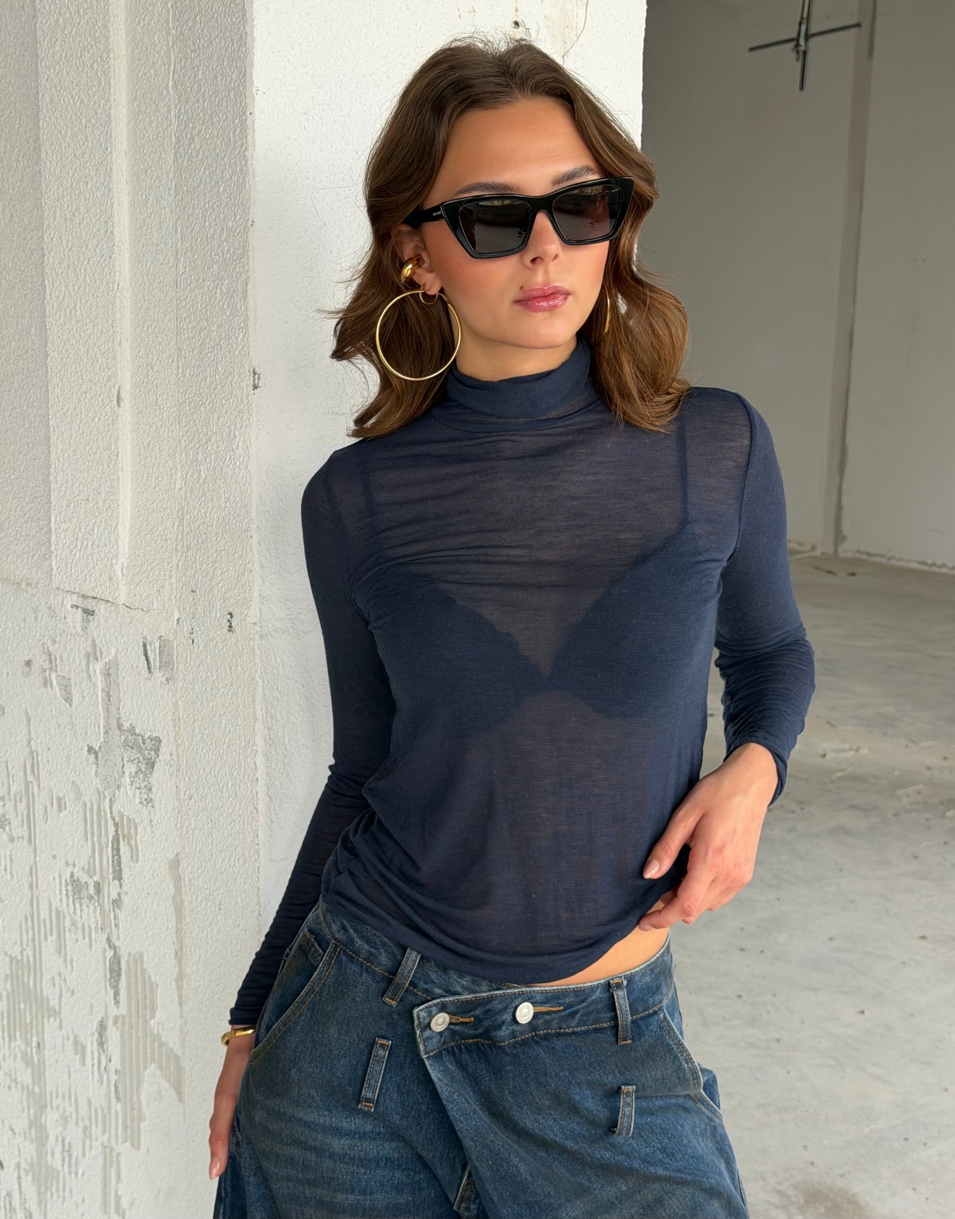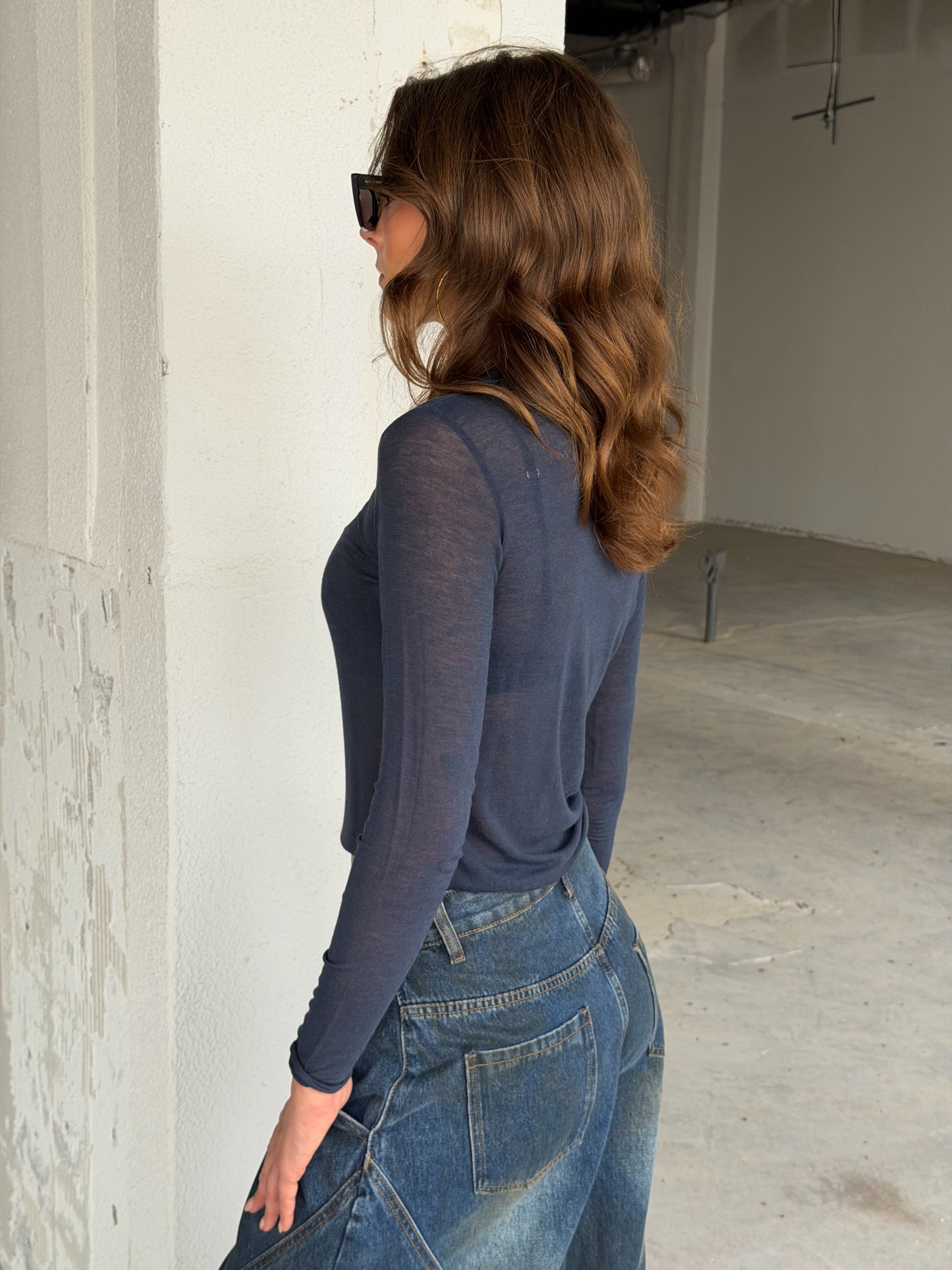 Prachtige blauwe basis top met een klein colletje. De top is licht doorschijnend.