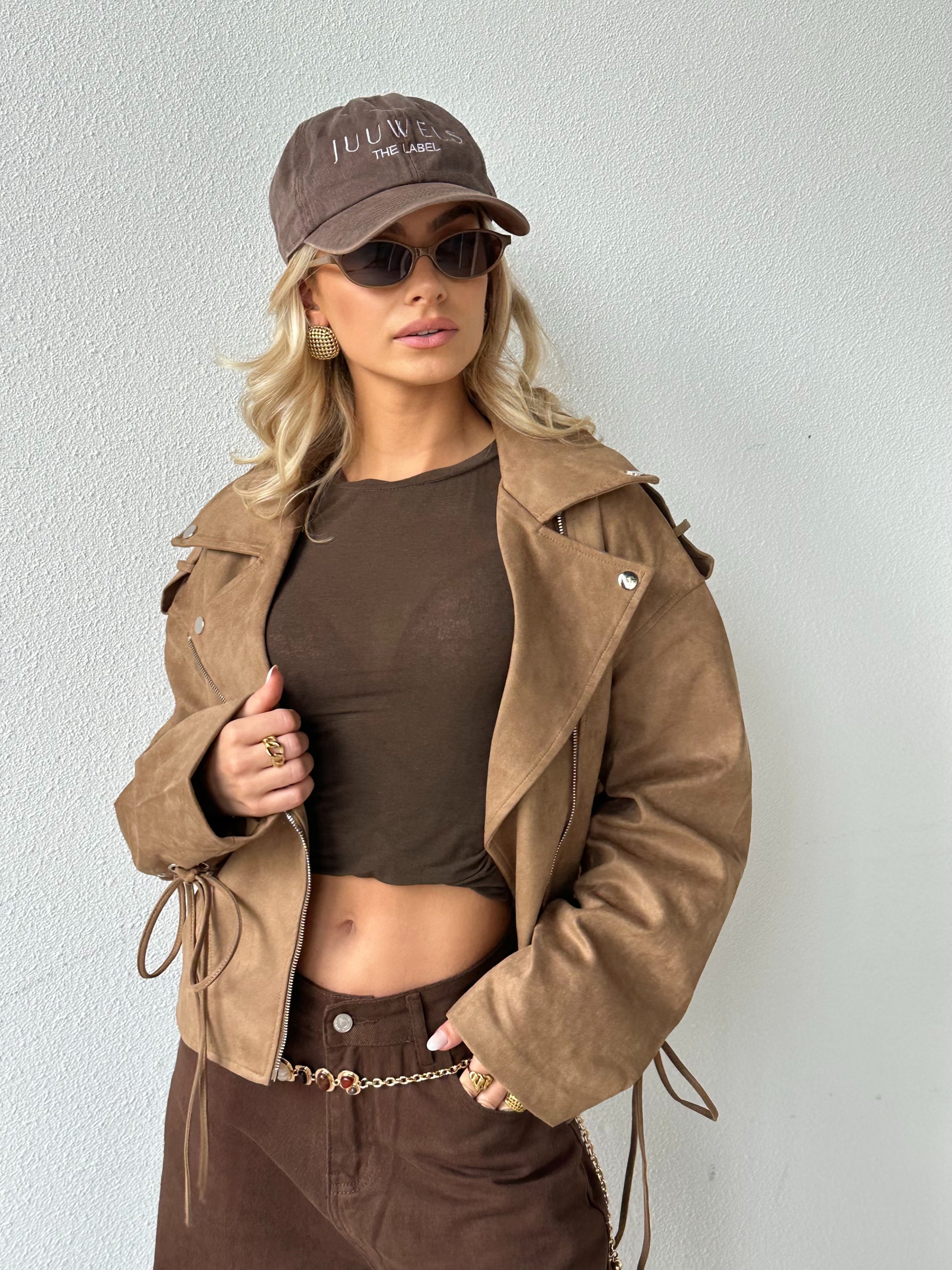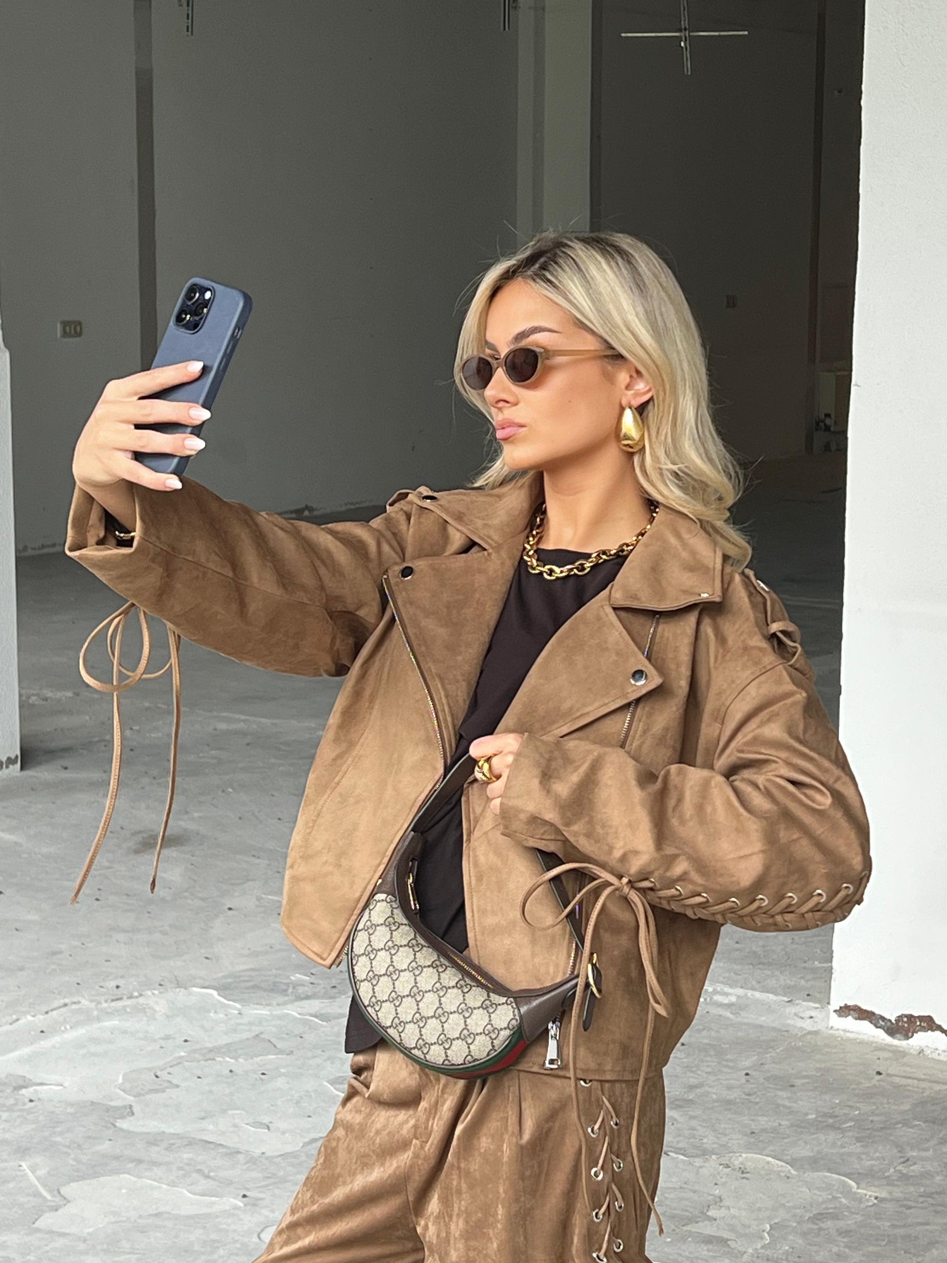 Stijlvolle camel suède look jasje met veterdetail langs de mouwen en op de rug.