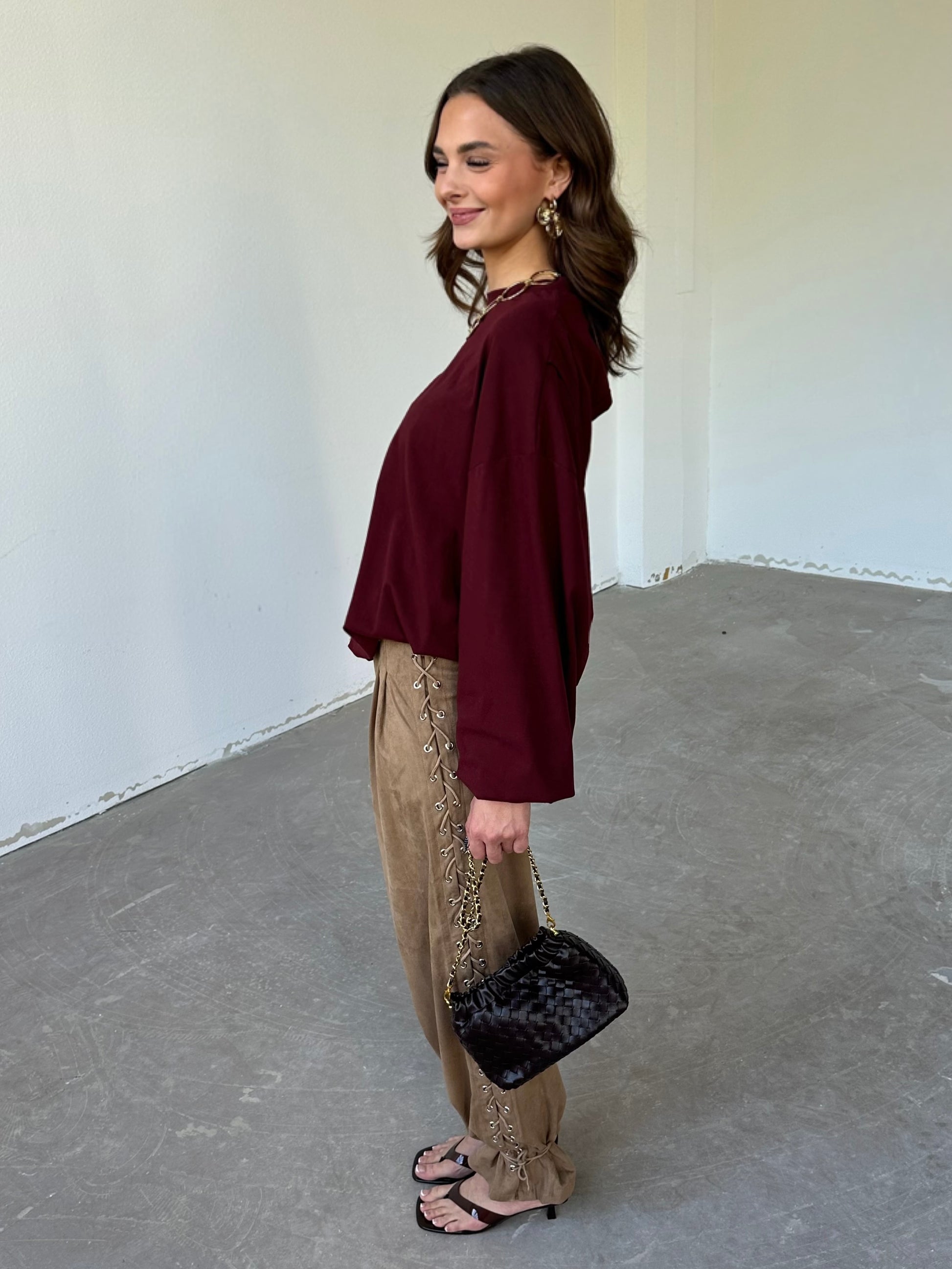 Stijlvolle camel suède look broek met veterdetail langs het been.