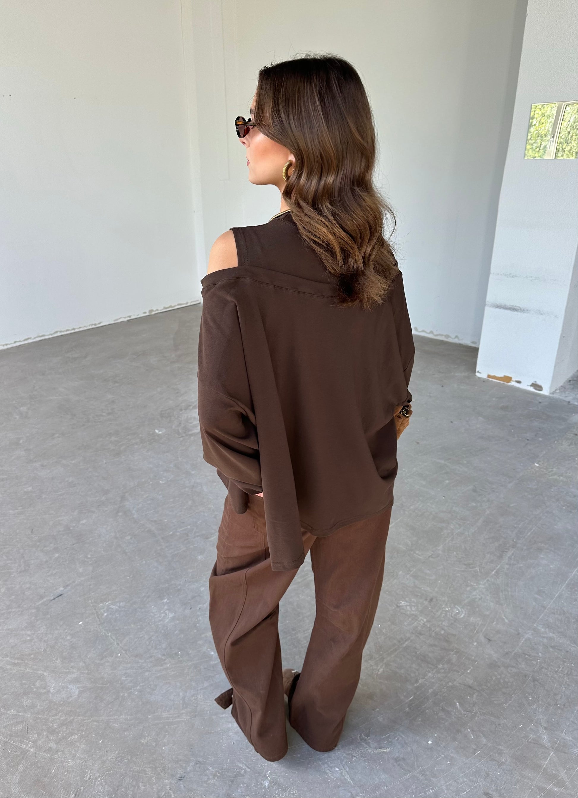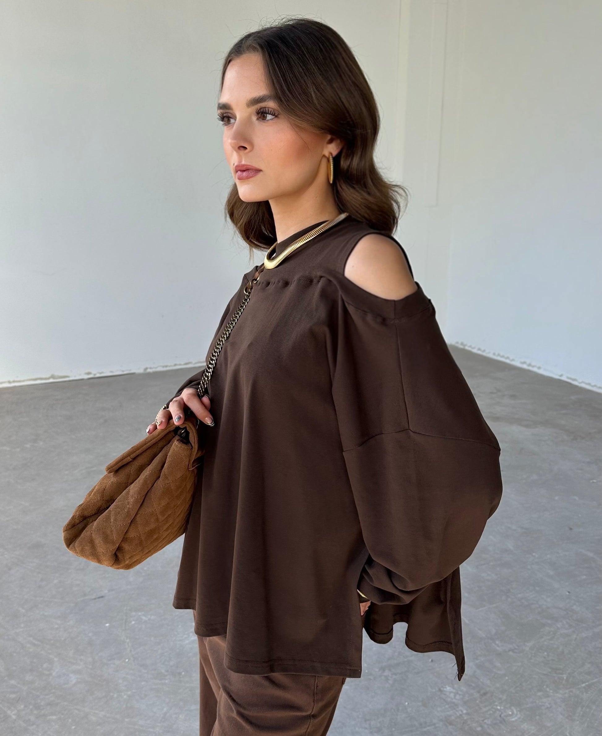Bruine oversized longsleeve met uniek schouderdetail. De cut-out op de schouder geeft een stoere en trendy uitstraling.