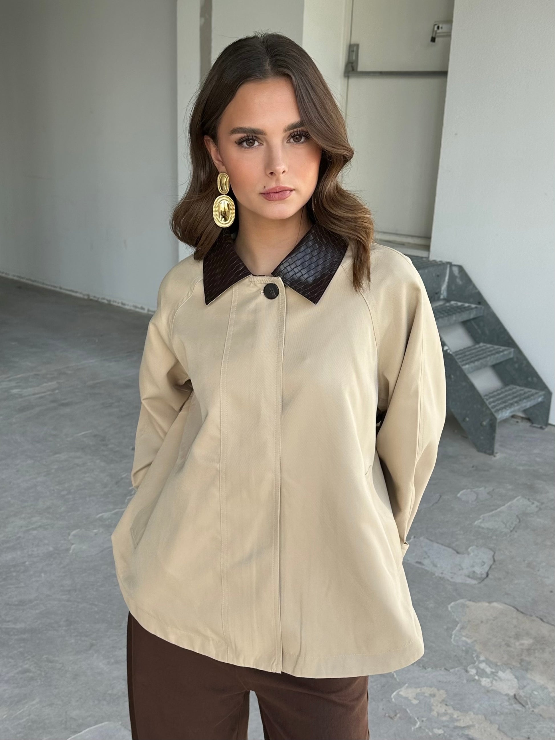 • Kleur: Beige en kraag donker bruin