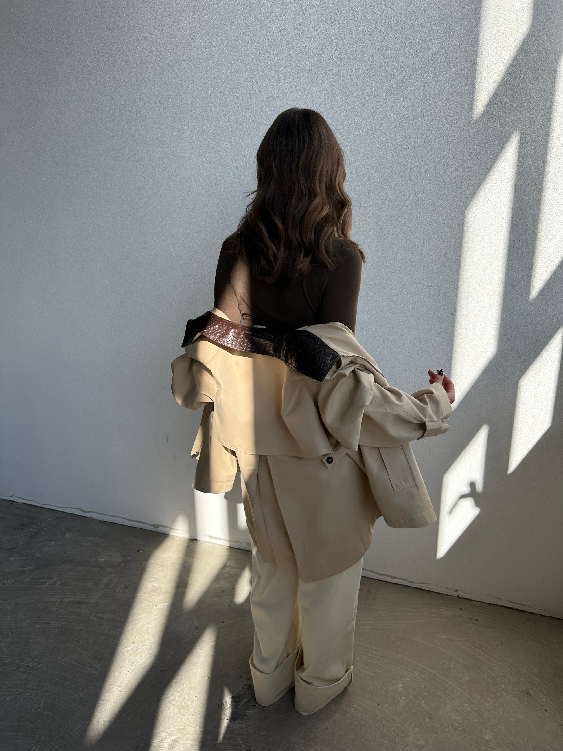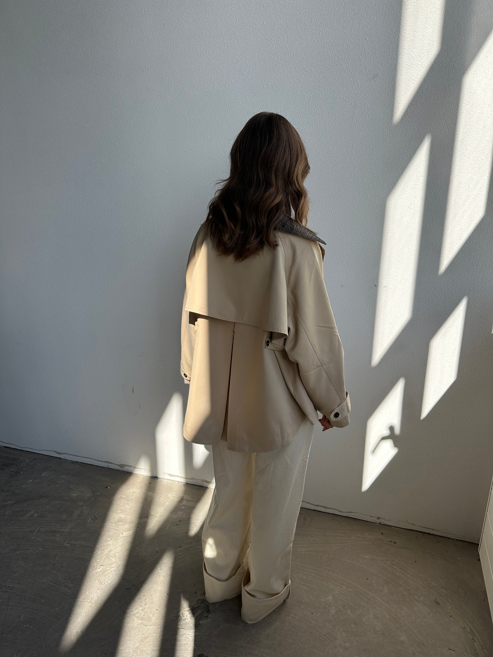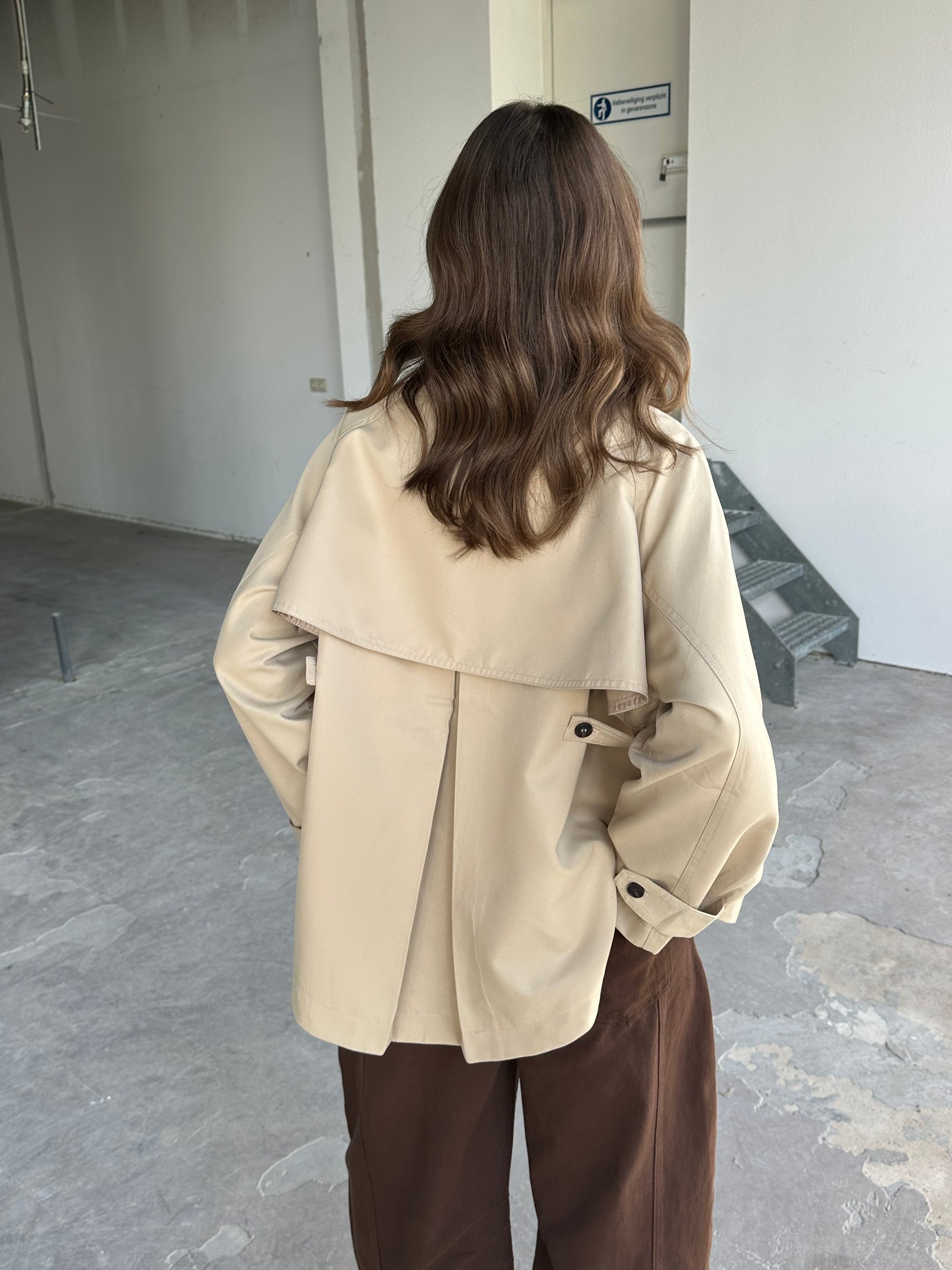 Beige trenchcoat en poncho look in één. Luxe gevoerd jasje, stoer maar ook klassiek te dragen.