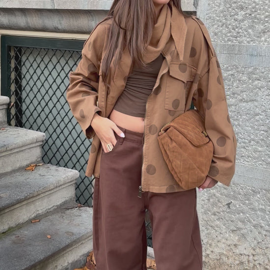 Camel jasje met bruine stippen met een stoere oversized pasvorm. Draag het buiten als stylish jasje of binnen als hip colbertje. Lekker opvallend, maar makkelijk te combineren!