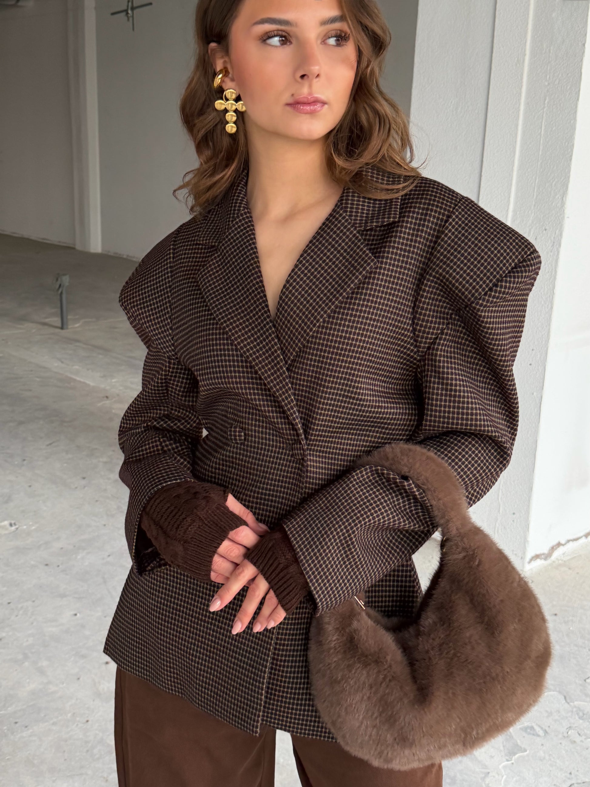 Geblokt en bruin en extra mooi getailleerd voor een krachtige look. De extra brede schouders geven de blazer die edgy, high fashion vibe waardoor elke outfit meteen next level wordt.