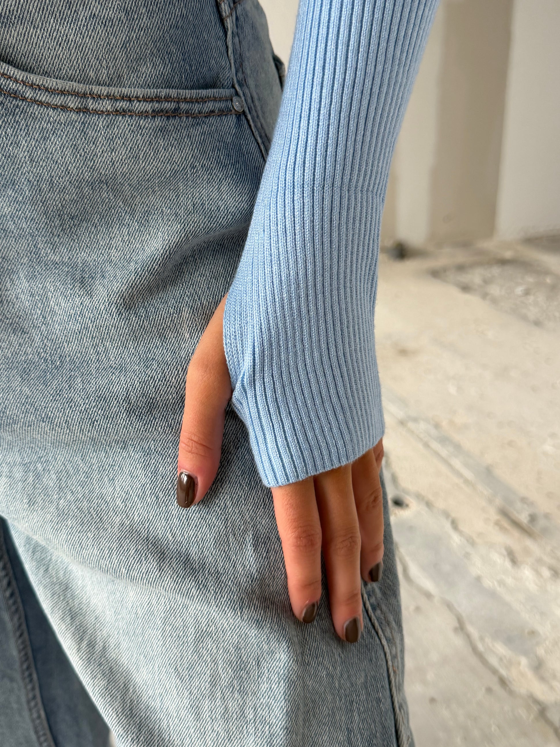 Lichtblauw vestje in een mooie zachte stof met lange mouwen en duimgaten en een dubbele rits. Je opent de rits aan de bovenkant en onderkant. Zo bepaal je zelf de look en pasvorm.