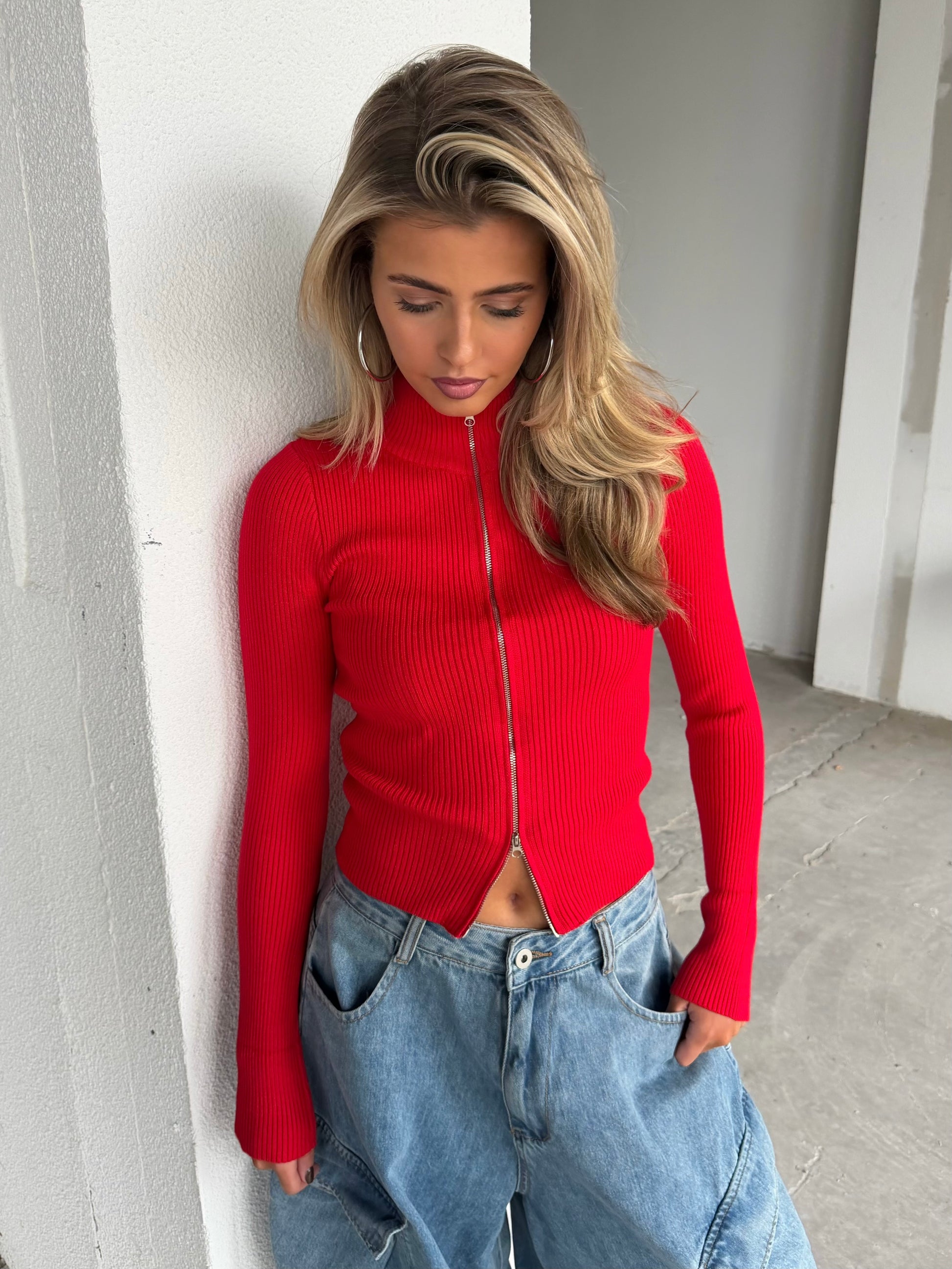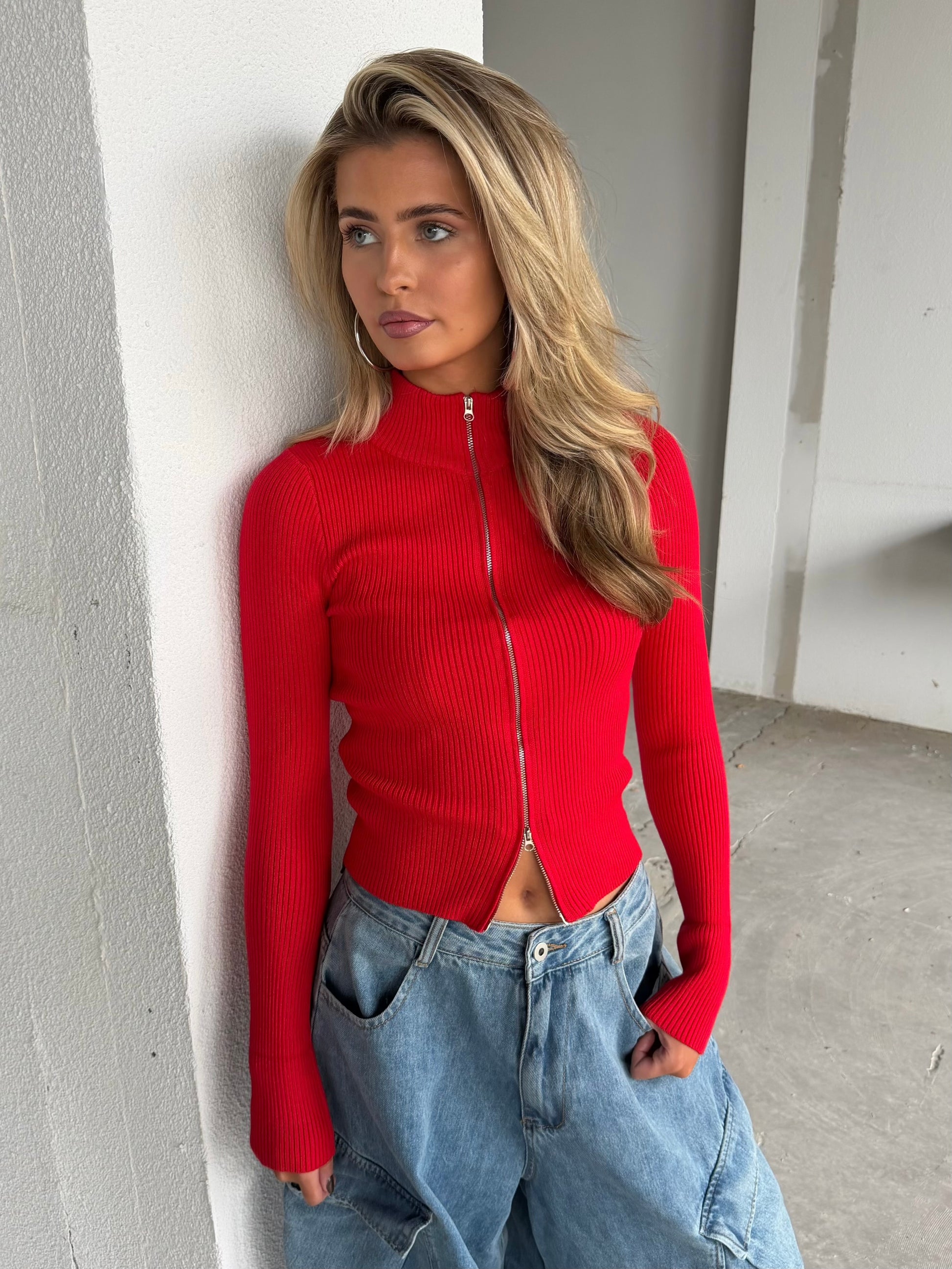 Rood vestje in een mooie zachte stof met lange mouwen en een dubbele rits. Je opent de rits aan de bovenkant en onderkant. Zo bepaal je zelf de look en pasvorm.