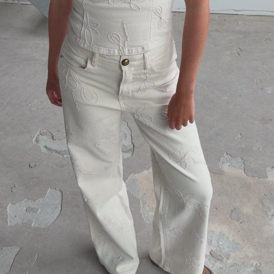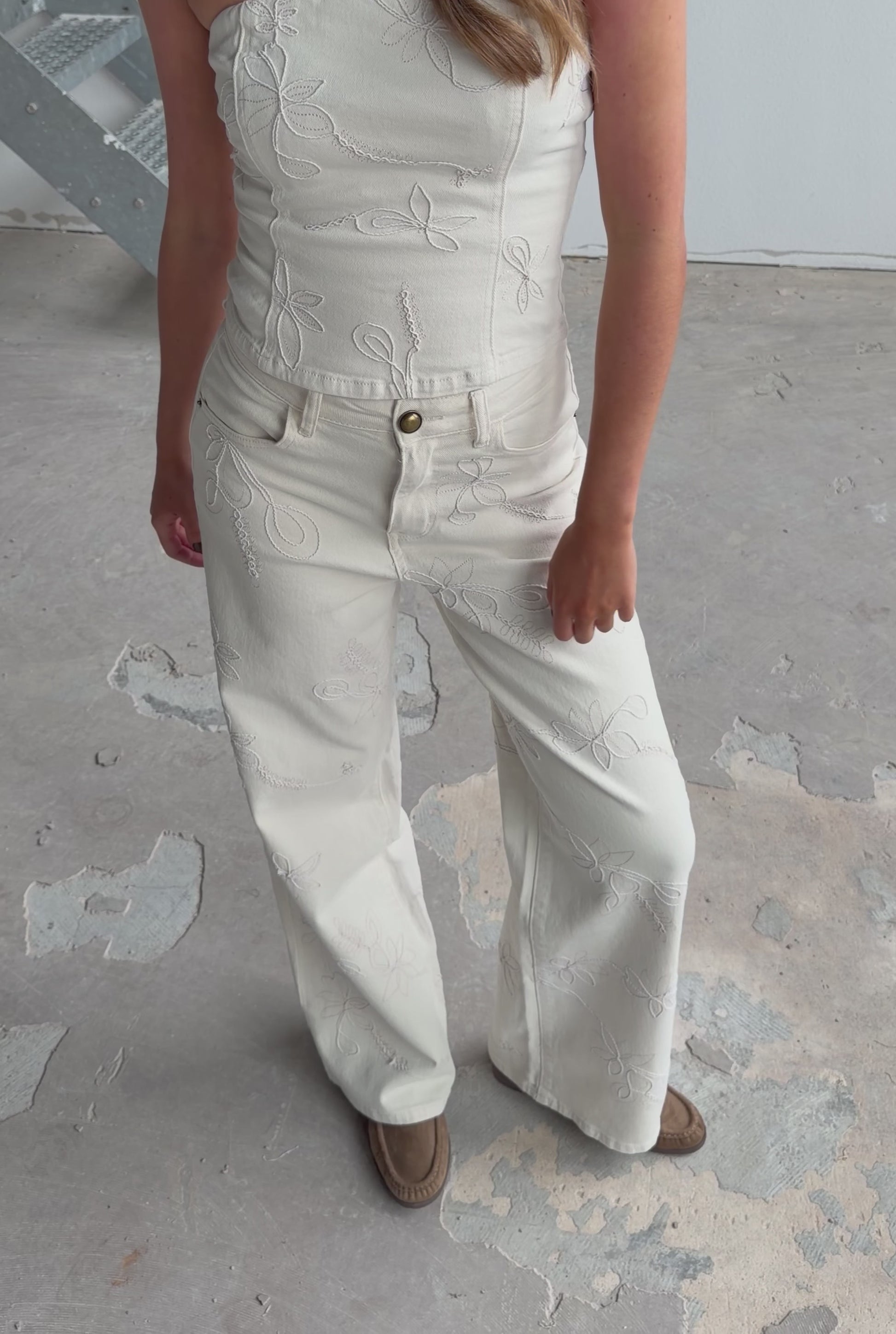 Wide leg jeans met ingenaaide bloemen. Zachte denim met veel stretch. Mooi als set te dragen met de bijpassende Joly top.