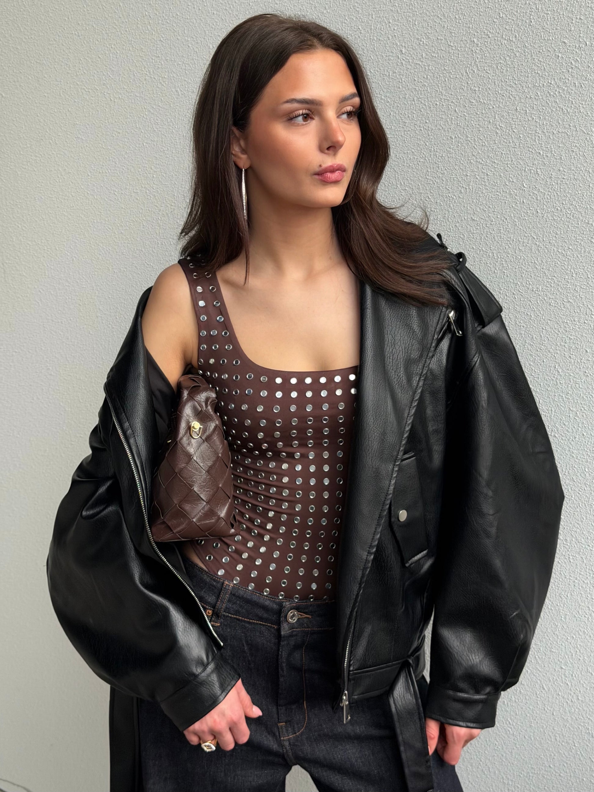 Deze body heeft een perfecte hals en een mooie aansluitende fit. De studs geven een glam uitstraling zonder te overdrijven. Draag hem op een jeans met onze Palmer jacket en je bent ready to go! Een body die direct opvalt en lekker zit.