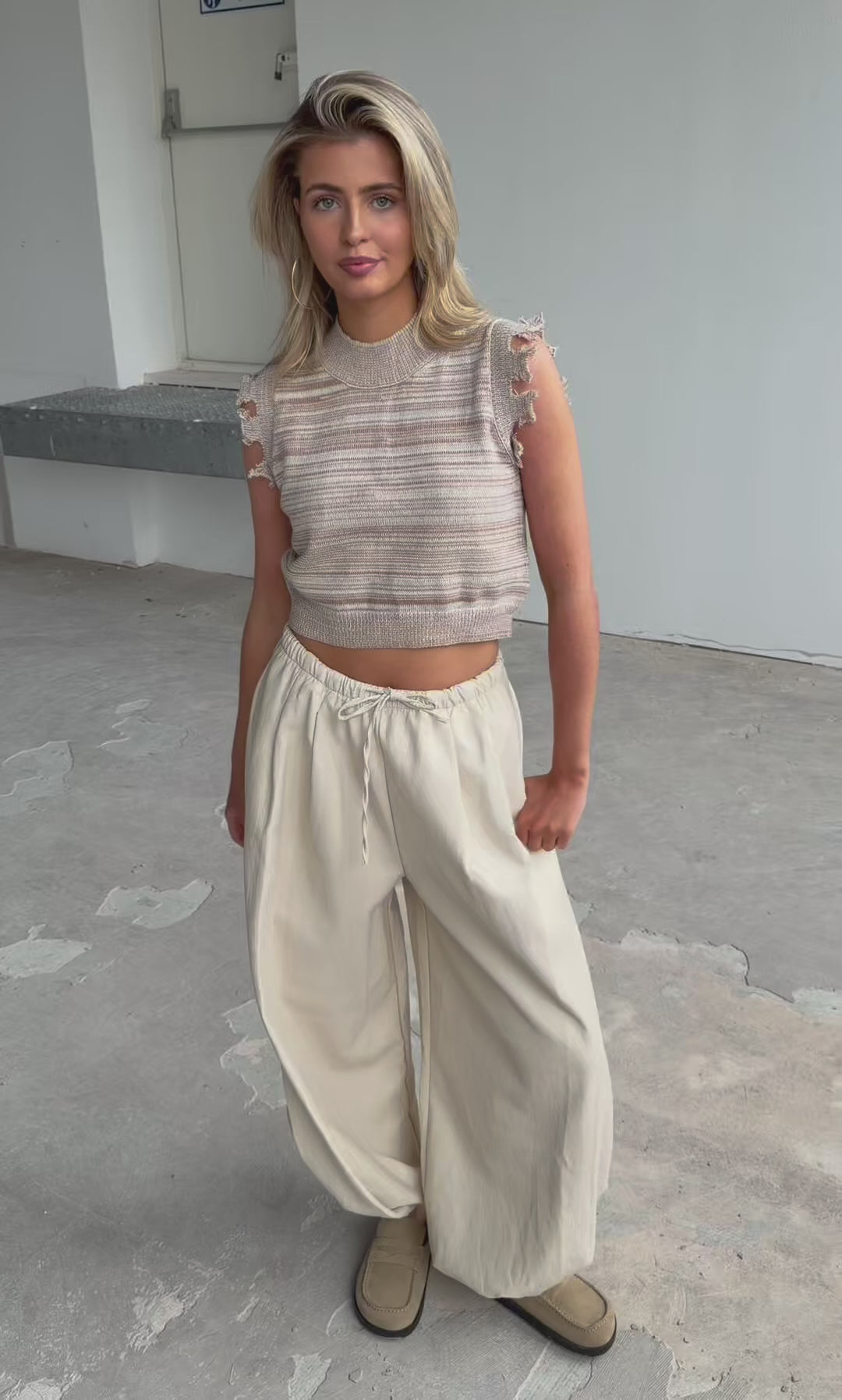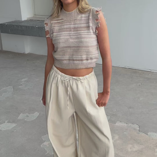 Korte cropped top van fijn materiaal. Boxy fit. Met hoge kraag en gerafelde mouwtjes als extra stoer detail.