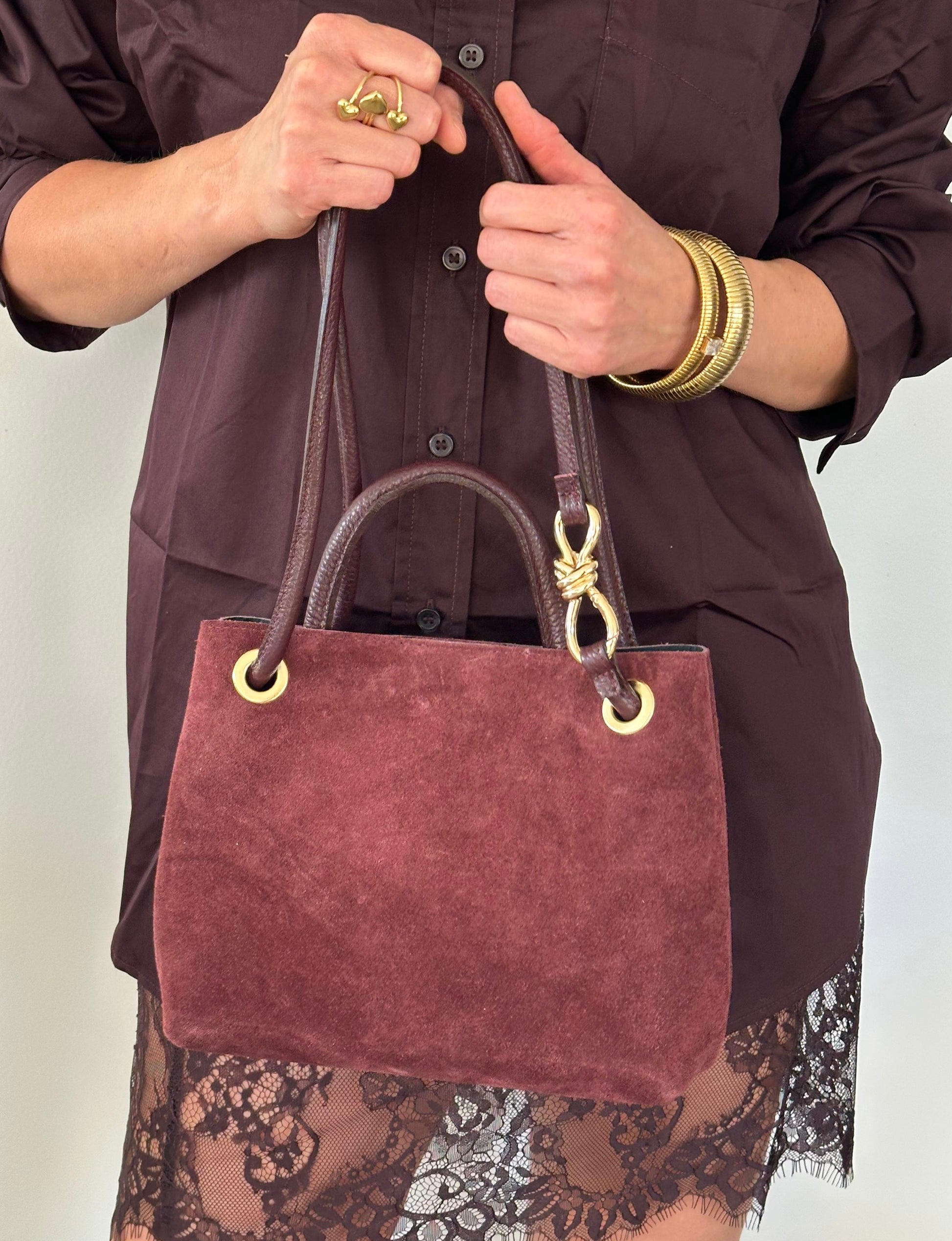 Een stijlvolle eyecatcher in een diepe bordeauxrode tint. Deze tas combineert luxe suède met hoogwaardig leer voor een elegante en tijdloze uitstraling. Het subtiele gouden detail geeft een verfijnde finishing touch.