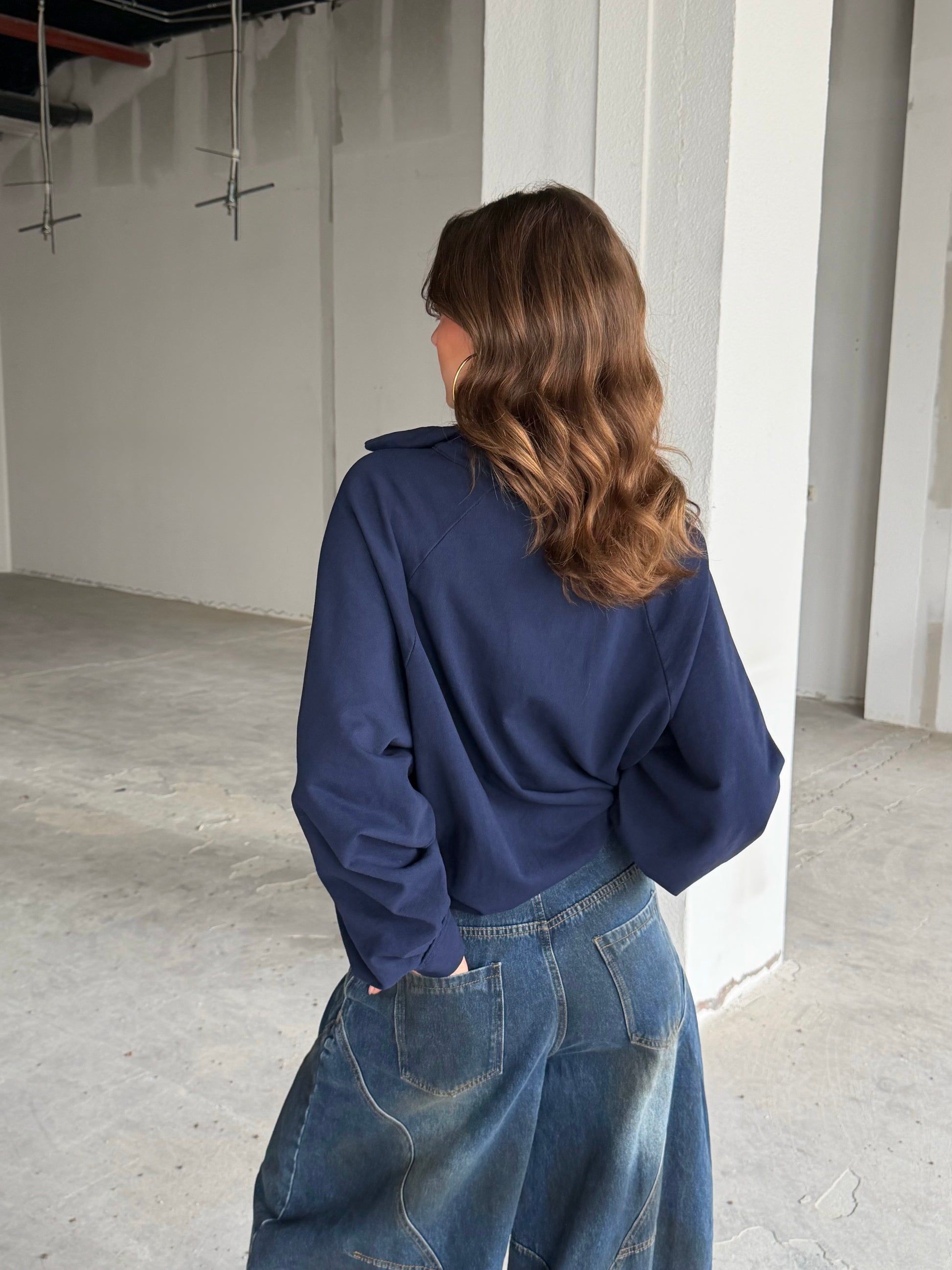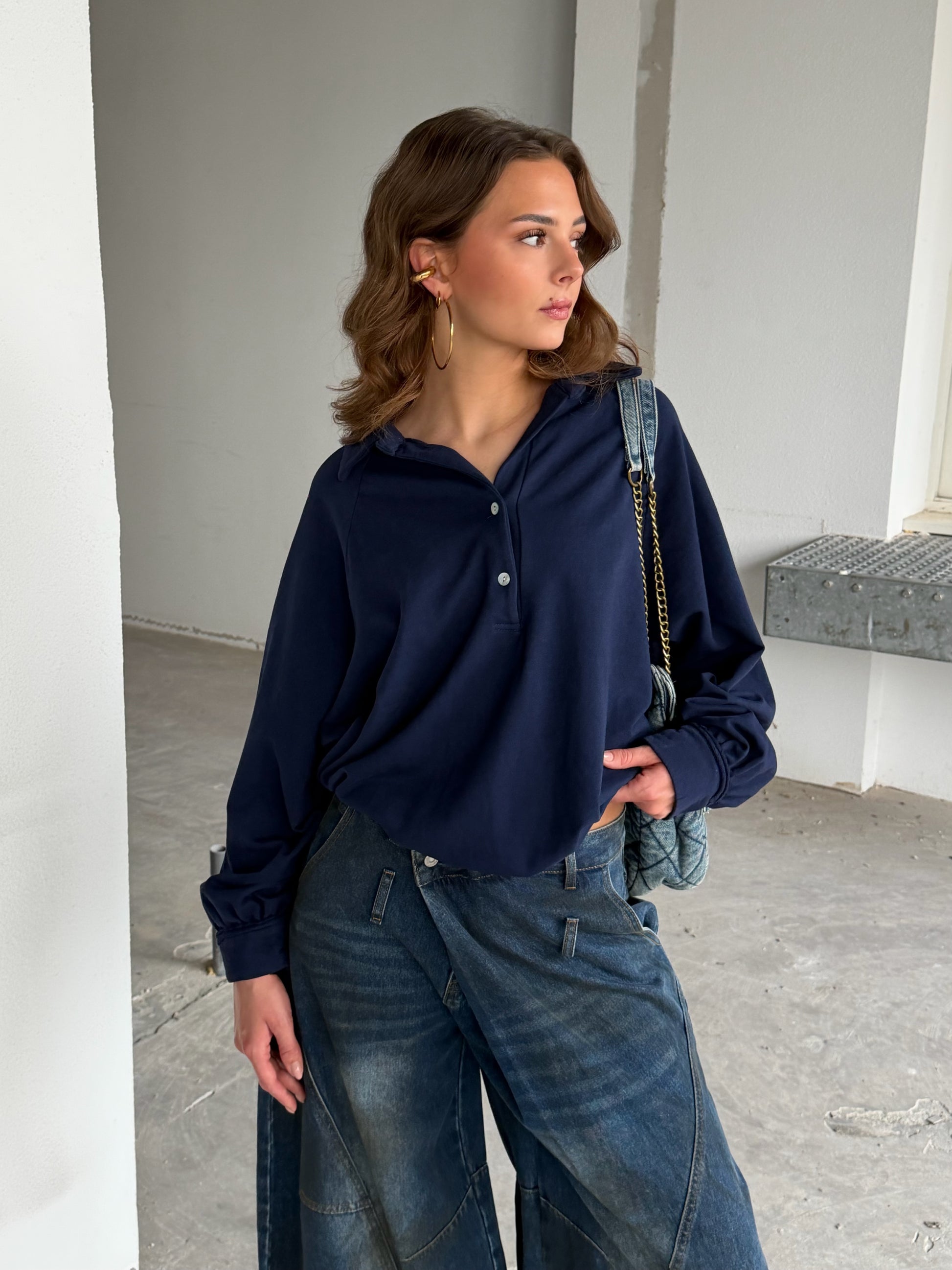 Joggingstof sweater, nonchalante trui met een twist. Heerlijk comfortabel model met een leuk kraagje en twee knoopjes voor net dat beetje extra. Perfect voor een relaxed maar stijlvolle look!