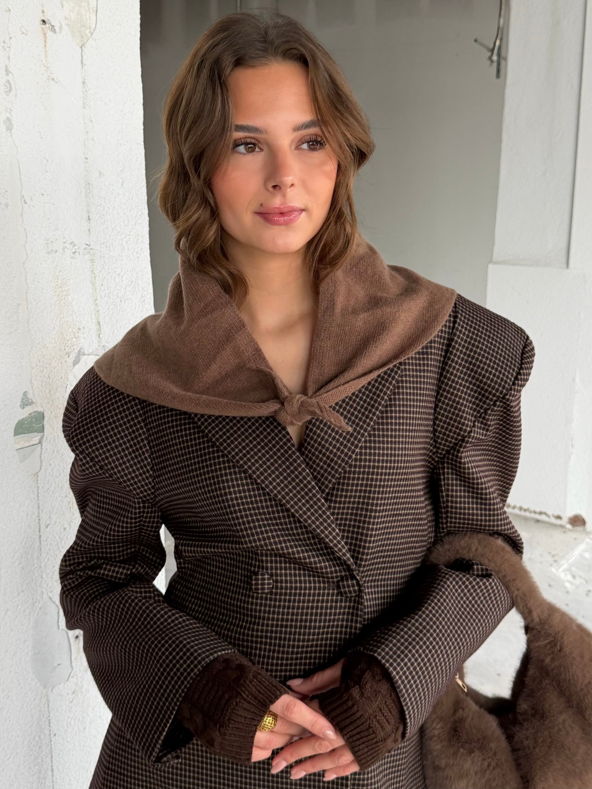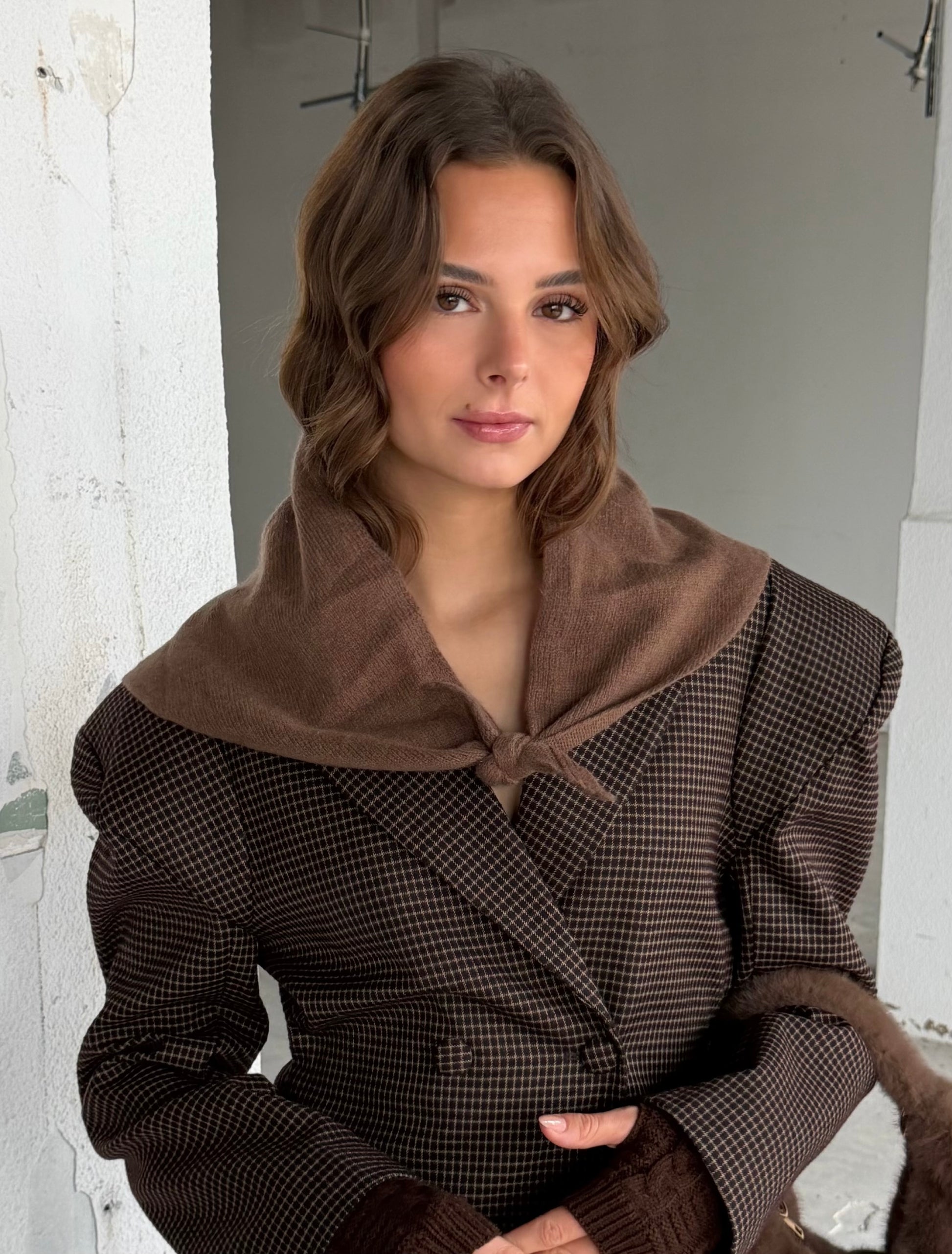 Gebreid driehoek sjaal. Warm, voelt heel zacht en is veelzijdig. Draag het sjaaltje met de punt naar achter voor een speelse look, of omgeslagen met de punt aan de voorkant voor extra warmte.