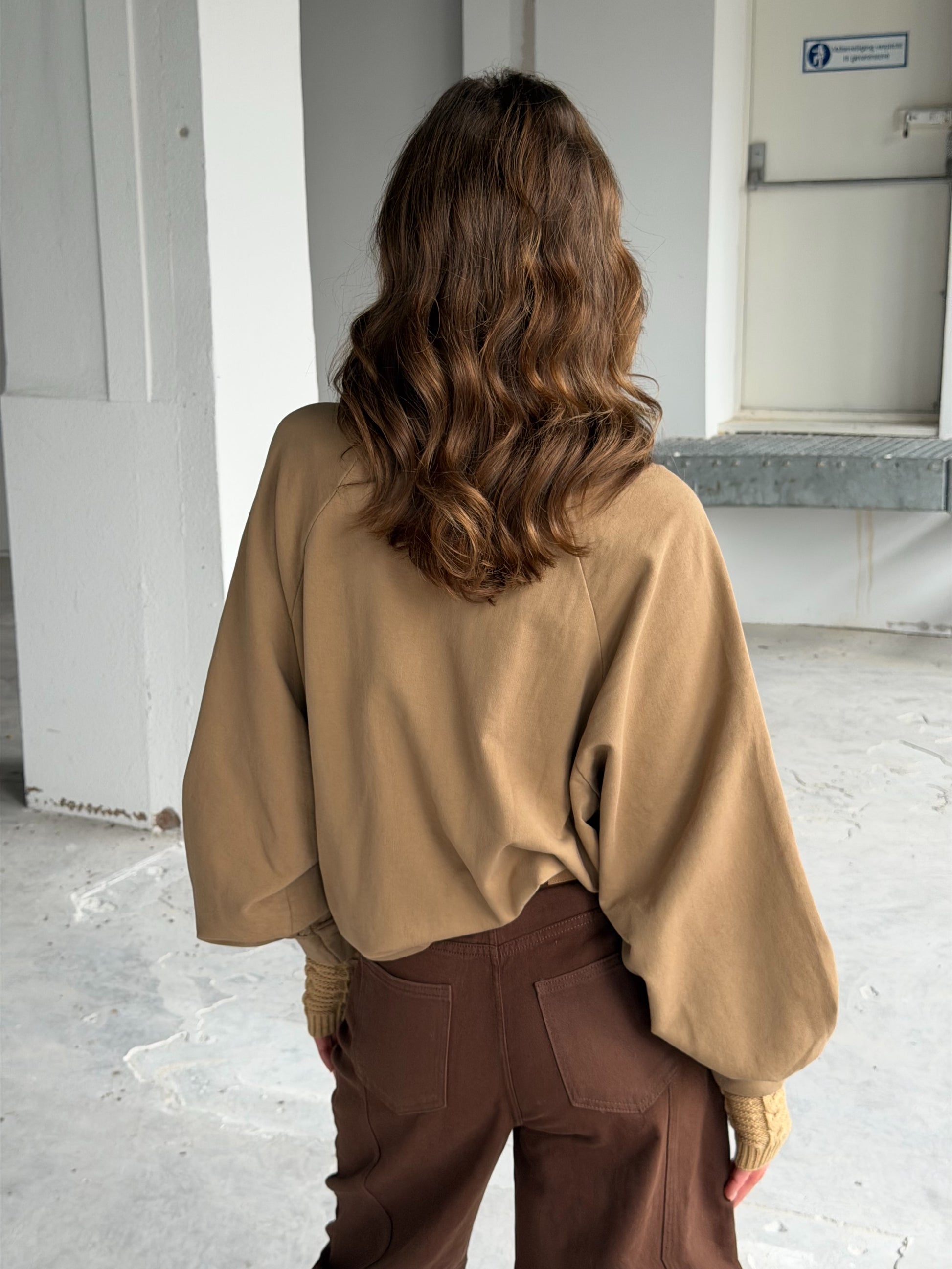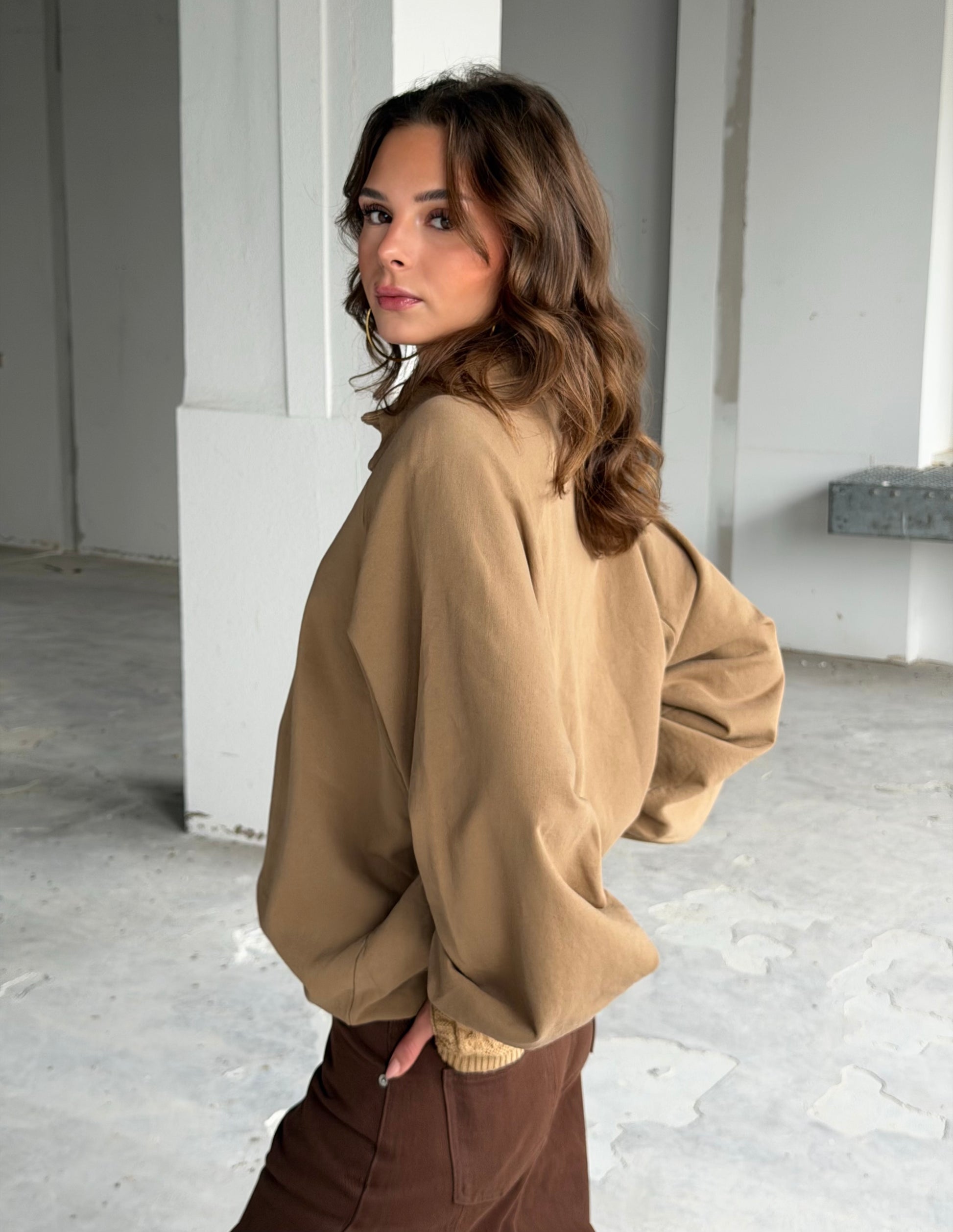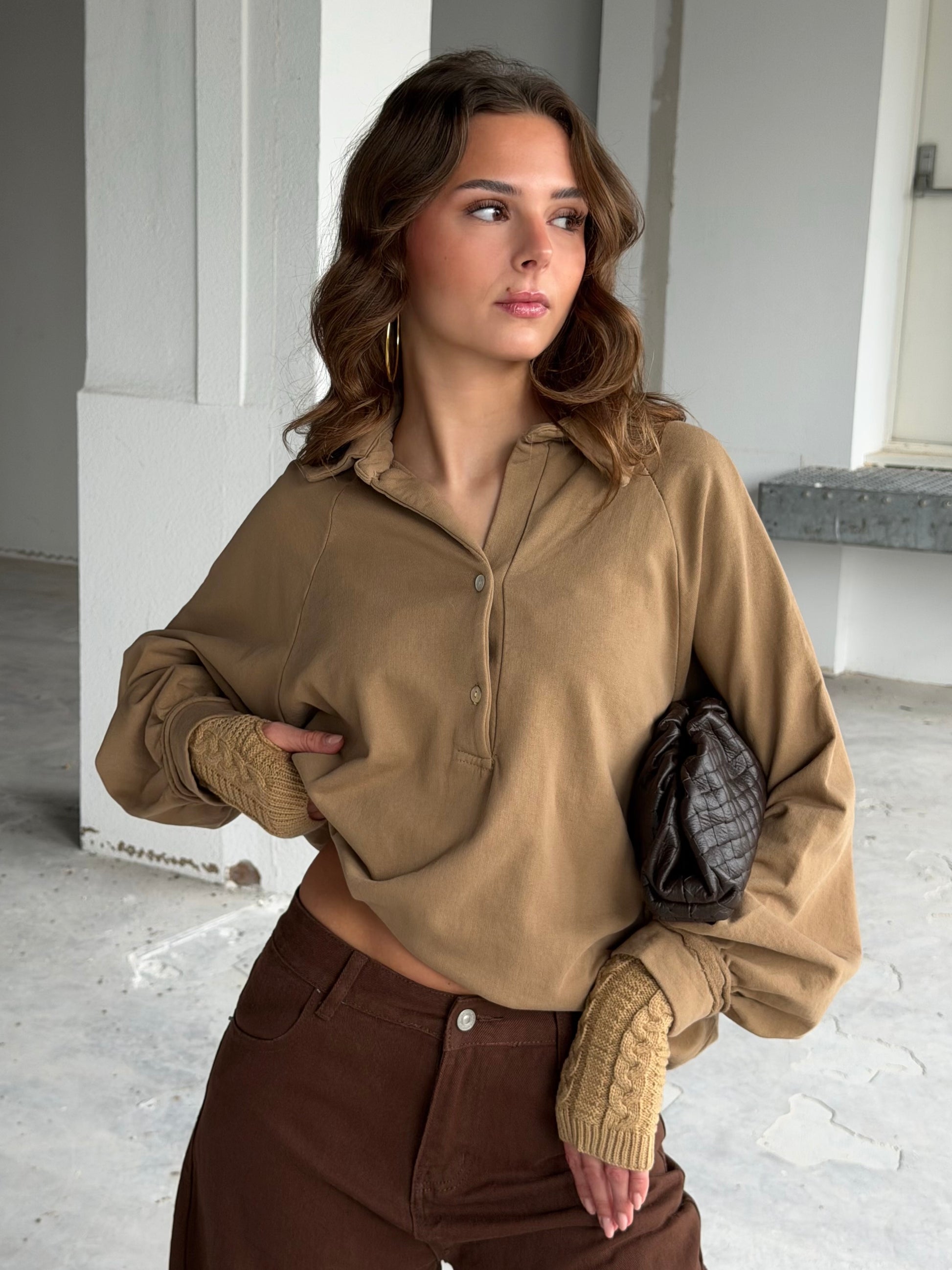 Joggingstof sweater, nonchalante trui met een twist. Heerlijk comfortabel model met een leuk kraagje en twee knoopjes voor net dat beetje extra. Perfect voor een relaxed maar stijlvolle look!
