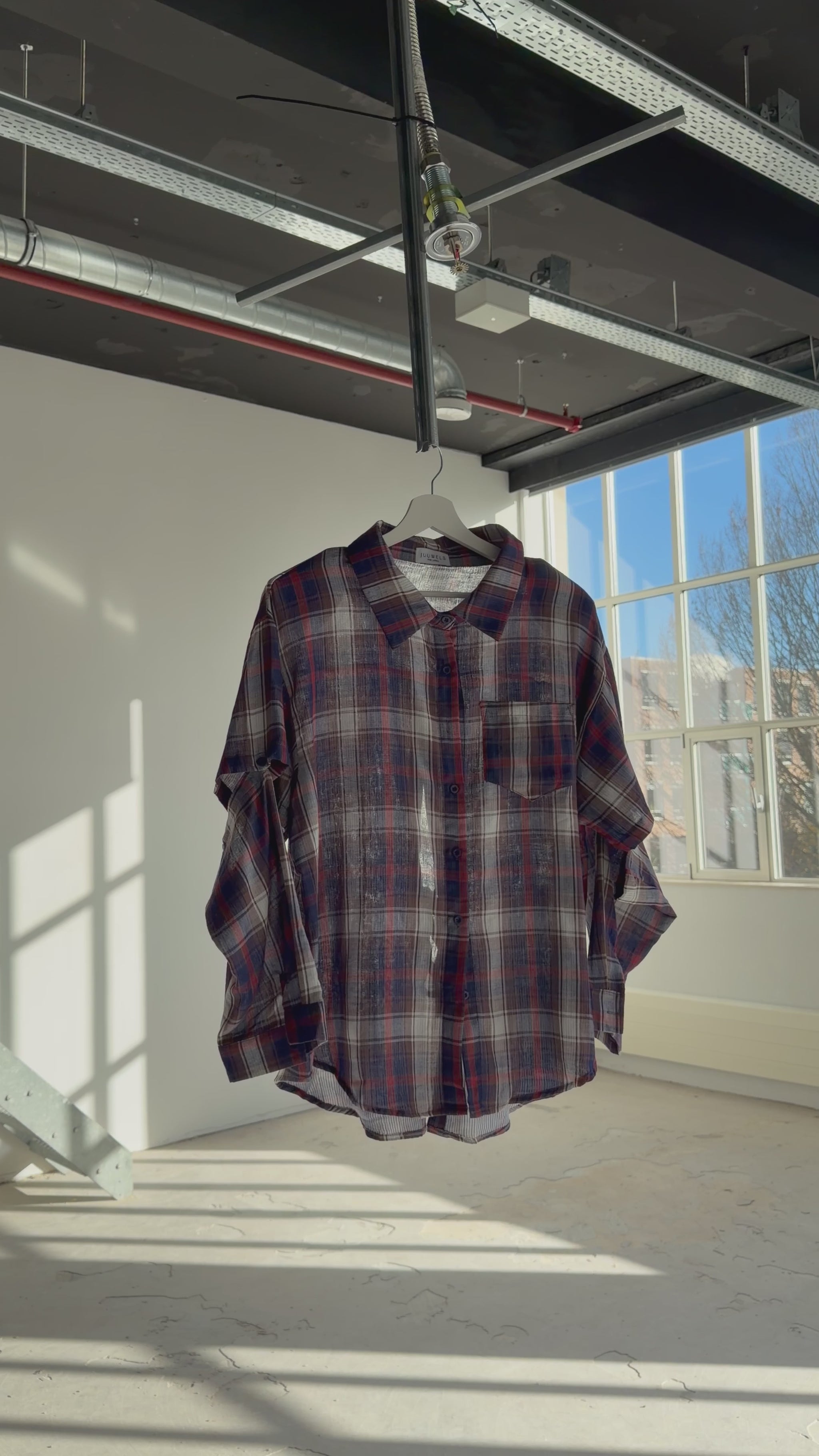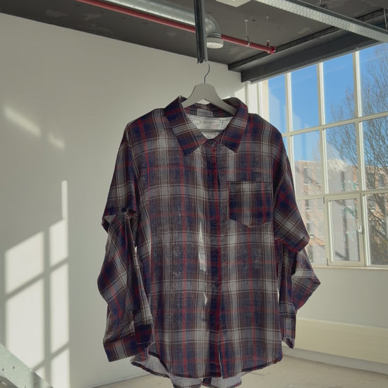 Stijlvolle geblokte blouse in blauwtinten. De mouwen hebben een speels en uniek detail, ze zijn open bij de elleboog en kunnen weer worden vastgezet met kleine knoopjes. Een comfortabele en modieuze blouse.